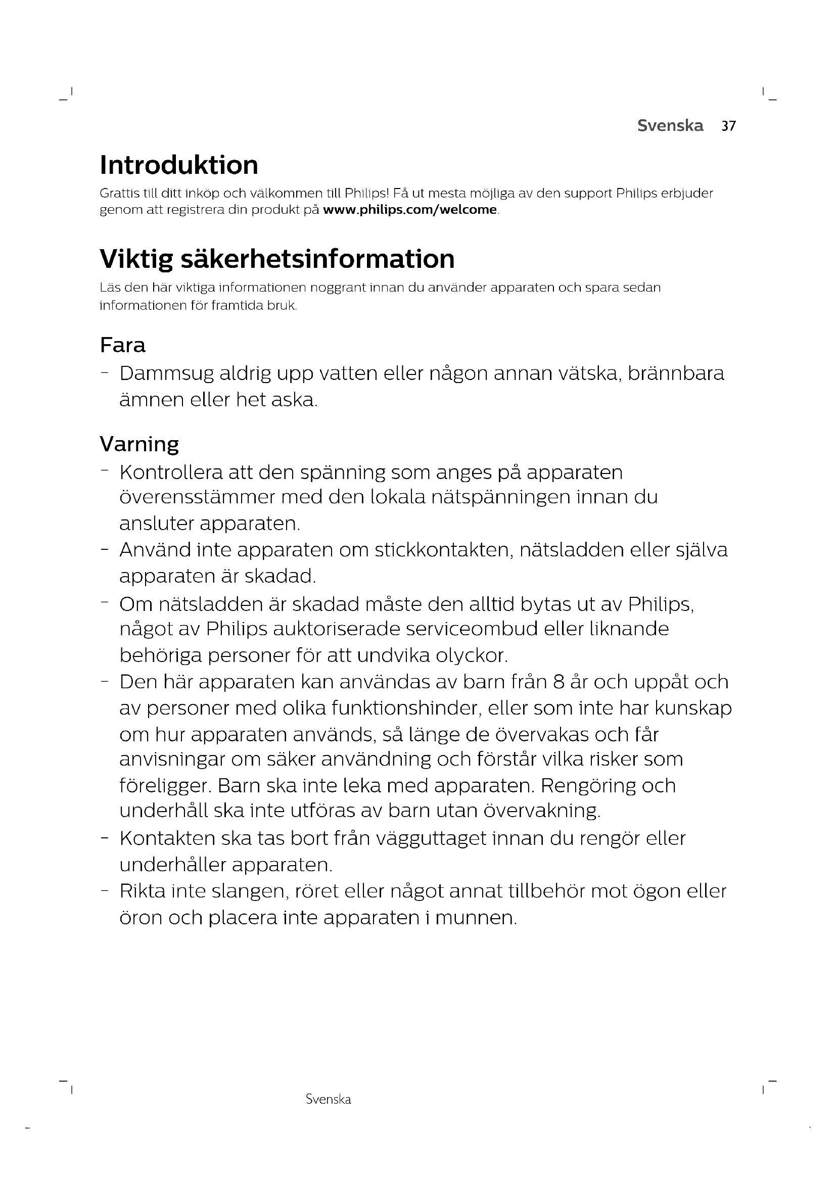 SuomiSvenska Introduktion Grattis till ditt inköp och välkommen till Philips! Få ut mesta möjliga av den support Philips erbjudergenom att registrera din produkt på www.philips.com/welcome. Viktig säkerhetsinformation Läs den här viktiga informationen noggrant innan du använder apparaten och spara sedaninformationen för framtida bruk. Fara
