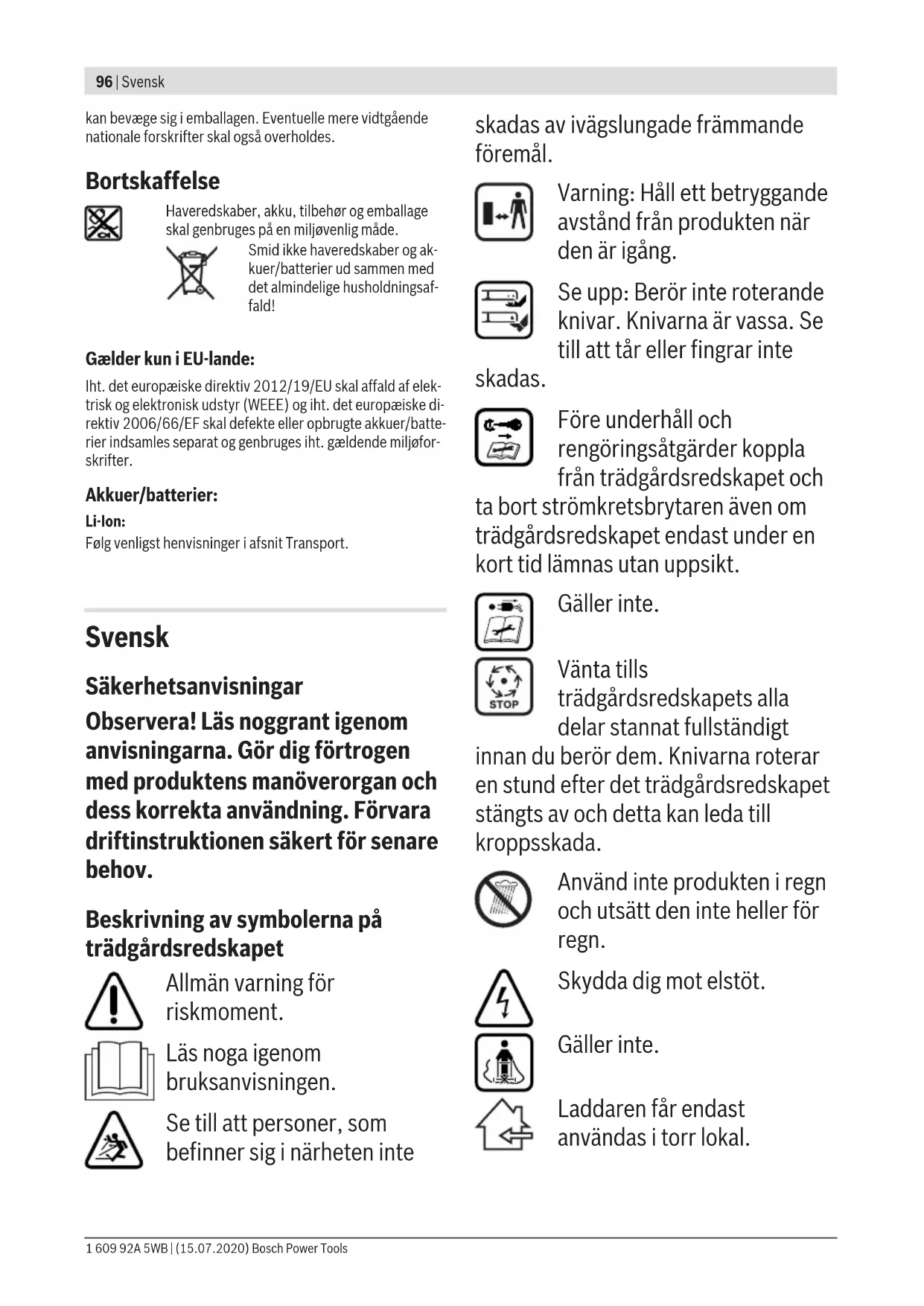 Løbetiden forlænges ved at købe en ekstra akku hos et auto- riseret servicecenter for Bosch haveredskab. Fejlsøgning Symptom Mulig årsag Afhjælpning Motoren går ikke i gang Haveredskabets indvendige ledninger er beskadi- get Kontakt Bosch kundeservicen Akkuen er afladt Oplad akkuen Akkuen er for kold/varm Opvarm/afkøl akkuen Græs for langt Maks. tilladt græshøjde er 30 cm med den største indstilling af slåhøjden Motorværn er aktiveret Lad motoren afkøle og indstil en større slåhøjde Strømkredsafbryderen er ikke blevet sat rigtigt i/ fuldstændigt i Sæt den rigtigt i Haveredskab kører i intervaller Haveredskabets indvendige ledninger er beskadi- get Kontakt Bosch kundeservicen Motorværn er aktiveret Lad motoren afkøle og indstil en større slåhøjde Haveredskabet efter- lader et uregelmæssigt slåbillede, og/eller motoren arbejder tungt Slåhøjden er for lav Indstil en større slåhøjde Knive er sløve Skift knive (se Fig. K) Tilstopning mulig Sluk haveredskabet og løsn strømkredsafbry- deren 1 609 92A 5WB | (15.07.2020) Bosch Power ToolsDansk | 95 Symptom Mulig årsag Afhjælpning Kontrollér undersiden på haveredskabet og frigør det evt. for græs (brug altid havehandsker) Kniven er monteret forkert Montér kniven rigtigt Når haveredskabet tændes, drejer kniven ikke Kniven bremses af græsset Sluk haveredskabet og løsn strømkredsafbry- deren Fjern blokeringen (brug altid havehandsker) Knivmøtrikken/-skruen er løs Spænd knivmøtrikken/-skruen (27Nm) For stor vibration/støj Knivmøtrikken/-skruen er løs Spænd knivmøtrikken/-skruen (27Nm) Knivene er beskadigede Skift knive (se Fig. K) Akku og ladeaggregat Symptomer Mulig årsag Afhjælpning Den røde akku-kontrol- lampe blinker på lade- aggregatet Opladning er ikke mulig Akkuen er ikke sat (rigtigt) i Anbring akkuen korrekt på ladeaggregatet Akkukontakter er snavset Rengør akkukontakterne; f.eks. ved at sætte ak- kuen i og tage den ud flere gange eller erstatte den Akku defekt Skift akkuen Akku-kontrollamper ly- ser ikke på ladeaggre- gatet Ladeaggregatets netstik er ikke sat (rigtigt) i Sæt netstikket (helt) ind i stikdåsen Stikdåse, netkabel eller ladeaggregat er defekt Kontrollér netspændingen, lad evt. ladeaggrega- tet blive kontrolleret af en autoriseret servicecen- ter for Bosch-el‑værktøj Vedligeholdelse og service Akku-pleje u Bemærk! Sluk for haveredskabet, løsn strømkredsaf- bryderen og fjern akkuen samt græsboksen, før vedli- geholdelses- eller rengøringsarbejde gennemføres. u Brug altid havehandsker, hvis du håndterer eller ar- bejder i nærheden af skarpe knive. Overhold følgende forskrifter og foranstaltninger for at mu- liggøre en optimal brug af akkuen: – Beskyt akkuen mod fugtighed og vand. – Opbevar kun haveredskabet og akkuen ved temperaturer mellem -20 °C og 50 °C. Lad f.eks. ikke akkuen blive lig- gende i bilen om sommeren. – Opbevar akkuen separat og ikke i haveredskabet. – Lad ikke akkuen blive siddende i haveredskabet i solskinsvejr. – Den optimale temperatur til opbevaring af akkuen er 5 °C. – Rengør akkuens ventilationsåbninger en gang imellem med en blød, ren og tør pensel. Når driftstiden efter opladningen forkortes væsentligt, er det tegn på, at akkuen er slidt op og skal udskiftes. Kundeservice og anvendelsesrådgivning Kundeservice besvarer dine spørgsmål vedr. reparation og vedligeholdelse af dit produkt samt reservedele. Eksplo- sionstegninger og oplysninger om reservedele finder du også på: www.bosch-pt.com Bosch-anvendelsesrådgivningsteamet hjælper dig gerne, hvis du har spørgsmål til produkter og tilbehørsdele. Produktets 10‑cifrede typenummer (se typeskilt) skal altid angives ved forespørgsler og bestilling af reservedele. Dansk Bosch Service Center Telegrafvej 3 2750 Ballerup På www.bosch-pt.dk kan der online bestilles reservedele el- ler oprettes en reparations ordre. Tlf. Service Center: 44898855 Fax: 44898755 E-Mail: vaerktoej@dk.bosch.com Du finder adresser til andre værksteder på: www.bosch-pt.com/serviceaddresses Transport De indeholdte Li-Ion-akkuer overholder bestemmelserne om farligt gods. Akkuerne kan transporteres af brugeren på of- fentlig vej uden yderligere pålæg. Ved forsendelse gennem tredjemand (f.eks.: lufttransport el- ler spedition) skal særlige krav vedr. emballage og mærkning overholdes. Her skal man kontakte en faregodsekspert, før forsendelsesstykket forberedes. Send kun akkuer, hvis huset er ubeskadiget. Tilklæb åbne kontakter og indpak akkuen på en sådan måde, at den ikke Bosch Power Tools 1 609 92A 5WB | (15.07.2020)96 | Svensk kan bevæge sig i emballagen. Eventuelle mere vidtgående nationale forskrifter skal også overholdes. Bortskaffelse Haveredskaber, akku, tilbehør og emballage skal genbruges på en miljøvenlig måde. Smid ikke haveredskaber og ak- kuer/batterier ud sammen med det almindelige husholdningsaf- fald! Gælder kun i EU‑lande: Iht. det europæiske direktiv 2012/19/EU skal affald af elek- trisk og elektronisk udstyr (WEEE) og iht. det europæiske di- rektiv 2006/66/EF skal defekte eller opbrugte akkuer/batte- rier indsamles separat og genbruges iht. gældende miljøfor- skrifter. Akkuer/batterier: Li-Ion: Følg venligst henvisninger i afsnit Transport. Svensk Säkerhetsanvisningar Observera! Läs noggrant igenom anvisningarna. Gör dig förtrogen med produktens manöverorgan och dess korrekta användning. Förvara driftinstruktionen säkert för senare behov. Beskrivning av symbolerna på trädgårdsredskapet Allmän varning för riskmoment. Läs noga igenom bruksanvisningen. Se till att personer, som befinner sig i närheten inte skadas av ivägslungade främmande föremål. Varning: Håll ett betryggande avstånd från produkten när den är igång. Se upp: Berör inte roterande knivar. Knivarna är vassa. Se till att tår eller fingrar inte skadas. Före underhåll och rengöringsåtgärder koppla från trädgårdsredskapet och ta bort str