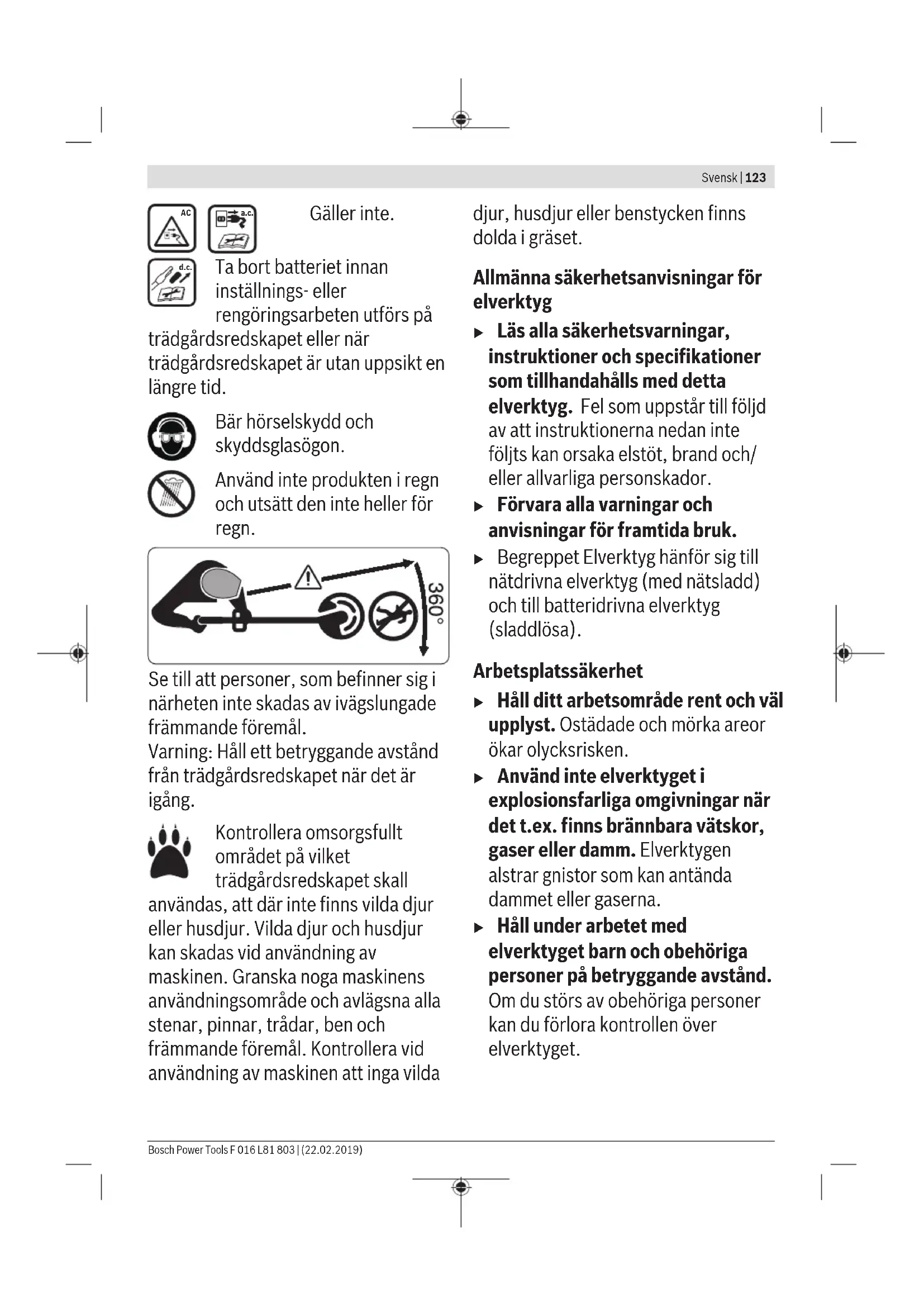 Se till att personer, som befinner sig i närheten inte skadas av ivägslungade främmande föremål. Varning: Håll ett betryggande avstånd från produkten när den är igång. F 016 L81 803 | (22.02.2019) Bosch Power ToolsSvensk | 123