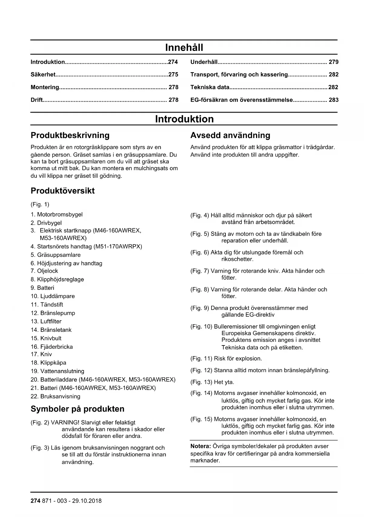 Symboler på produkten (Fig. 2) VARNING! Slarvigt eller felaktigt användande kan resultera i skador eller dödsfall för föraren eller andra. (Fig. 3) Läs igenom bruksanvisningen noggrant och se till att du förstår instruktionerna innan användning. (Fig. 4) Håll alltid människor och djur på säkert avstånd från arbetsområdet. (Fig. 5) Stäng av motorn och ta av tändkabeln före reparation eller underhåll. (Fig. 6) Akta dig för utslungade föremål och rikoschetter. (Fig. 7) Varning för roterande kniv. Akta händer och fötter. (Fig. 8) Varning för roterande delar. Akta händer och fötter. (Fig. 9) Denna produkt överensstämmer med gällande EG-direktiv (Fig. 10) Bulleremissioner till omgivningen enligt Europeiska Gemenskapens direktiv. Produktens emission anges i avsnittet Tekniska data och på etiketten. (Fig. 11) Risk för explosion. (Fig. 12) Stanna alltid motorn innan bränslepåfyllning. (Fig. 13) Het yta. (Fig. 14) Motorns avgaser innehåller kolmonoxid, en luktlös, giftig och mycket farlig gas. Kör inte produkten inomhus eller i slutna utrymmen. (Fig. 15) Motorns avgaser innehåller kolmonoxid, en luktlös, giftig och mycket farlig gas. Kör inte produkten inomhus eller i slutna utrymmen. Notera: Övriga symboler/dekaler på produkten avser specifika krav för certifieringar på andra kommersiella marknader. 274 871 - 003 - 29.10.2018EU V VARNING: Manipulering av motorn upphäver EG-typgodkännandet för den här produkten. Produktansvar Enligt lagstiftningen för produktansvar ansvarar vi inte för skador som vår produkt orsakar om: