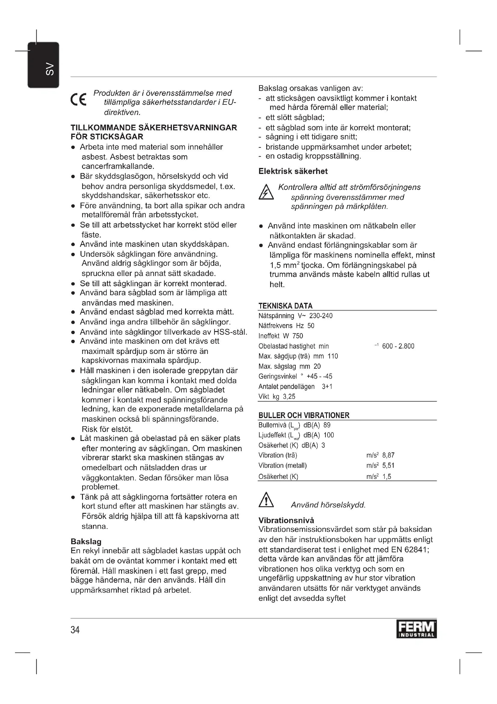 ● Arbeta inte med material som innehåller asbest. Asbest betraktas som cancerframkallande. ● Bär skyddsglasögon, hörselskydd och vid behov andra personliga skyddsmedel, t.ex. skyddshandskar, säkerhetsskor etc. ● Före användning, ta bort alla spikar och andra metallföremål från arbetsstycket. ● Se till att arbetsstycket har korrekt stöd eller fäste. ● Använd inte maskinen utan skyddskåpan. ● Undersök sågklingan före användning. Använd aldrig sågklingor som är böjda, spruckna eller på annat sätt skadade. ● Se till att sågklingan är korrekt monterad. ● Använd bara sågblad som är lämpliga att användas med maskinen. ● Använd endast sågblad med korrekta mått. ● Använd inga andra tillbehör än sågklingor. ● Använd inte sågklingor tillverkade av HSS-stål. ● Använd inte maskinen om det krävs ett maximalt spårdjup som är större än kapskivornas maximala spårdjup. ● Håll maskinen i den isolerade greppytan där sågklingan kan komma i kontakt med dolda ledningar eller nätkabeln. Om sågbladet kommer i kontakt med spänningsförande ledning, kan de exponerade metalldelarna på maskinen också bli spänningsförande. Risk för elstöt. ● Låt maskinen gå obelastad på en säker plats efter montering av sågklingan. Om maskinen vibrerar starkt ska maskinen stängas av omedelbart och nätsladden dras ur väggkontakten. Sedan försöker man lösa problemet. ● Tänk på att sågklingorna fortsätter rotera en kort stund efter att maskinen har stängts av. Försök aldrig hjälpa till att få kapskivorna att stanna. Bakslag En rekyl innebär att sågbladet kastas uppåt och bakåt om de oväntat kommer i kontakt med ett föremål. Håll maskinen i ett fast grepp, med bägge händerna, när den används. Håll din uppmärksamhet riktad på arbetet. Bakslag orsakas vanligen av: - att sticksågen oavsiktligt kommer i kontakt med hårda föremål eller material; - ett slött sågblad; - ett sågblad som inte är korrekt monterat; - sågning i ett tidigare snitt; - bristande uppmärksamhet under arbetet; - en ostadig kroppsställning. Elektrisk säkerhet
