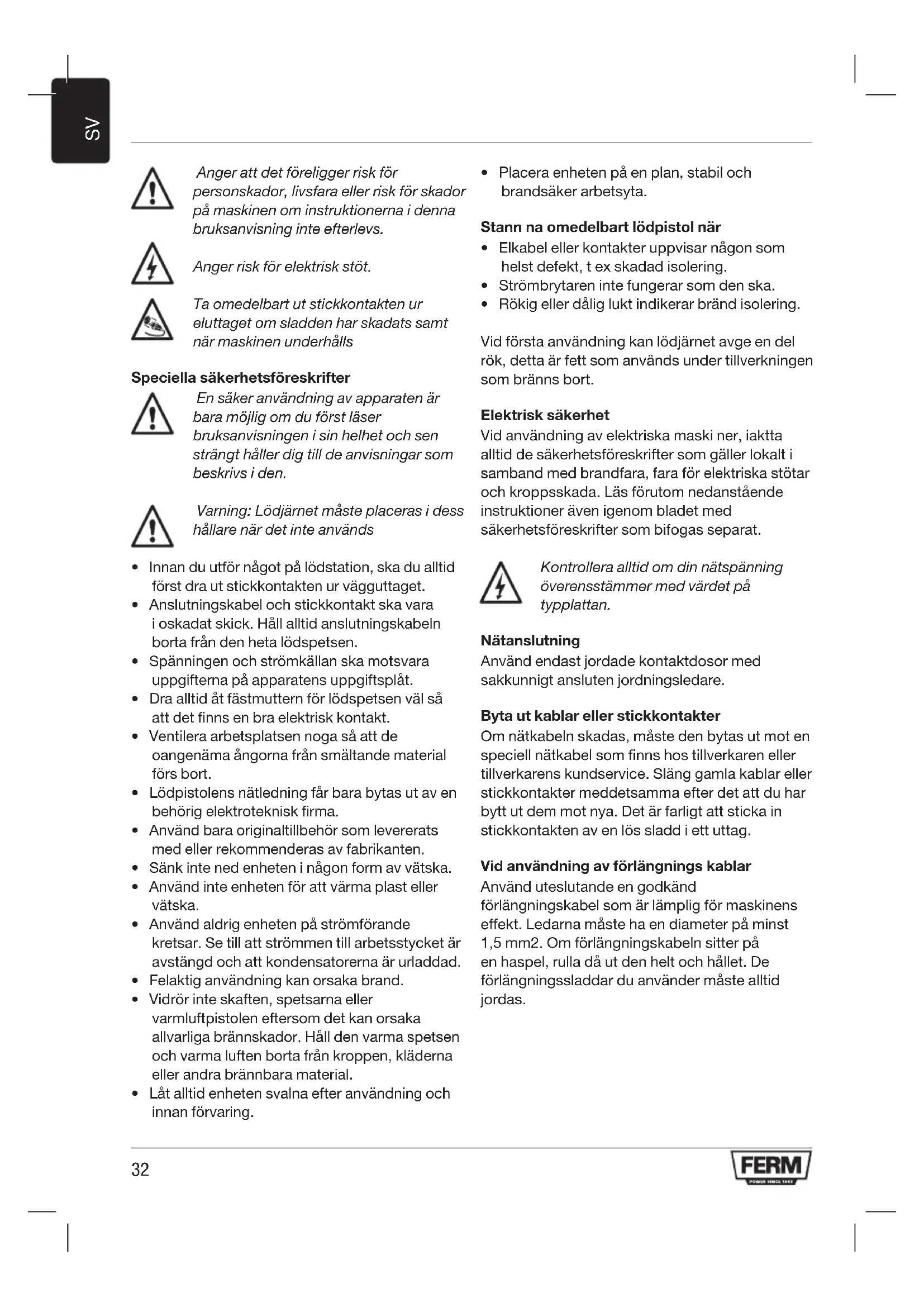 - Rökig eller dålig lukt indikerar bränd isolering. Vid första användning kan lödjärnet avge en del rök, detta är fett som används under tillverkningen som bränns bort. Elektrisk säkerhet Vid användning av elektriska maski ner, iaktta alltid de säkerhetsföreskrifter som gäller lokalt i samband med brandfara, fara för elektriska stötar och kroppsskada. Läs förutom nedanstående instruktioner även igenom bladet med säkerhetsföreskrifter som bifogas separat. Kontrollera alltid om din nätspänning överensstämmer med värdet på typplattan. Nätanslutning Använd endast jordade kontaktdosor med sakkunnigt ansluten jordningsledare. Byta ut kablar eller stickkontakter Om nätkabeln skadas, måste den bytas ut mot en speciell nätkabel som finns hos tillverkaren eller tillverkarens kundservice. Släng gamla kablar eller stickkontakter meddetsamma efter det att du har bytt ut dem mot nya. Det är farligt att sticka in stickkontakten av en lös sladd i ett uttag. Vid användning av förlängnings kablar Använd uteslutande en godkänd förlängningskabel som är lämplig för maskinens effekt. Ledarna måste ha en diameter på minst 1,5 mm2. Om förlängningskabeln sitter på en haspel, rulla då ut den helt och hållet. De förlängningssladdar du använder måste alltid jordas.33