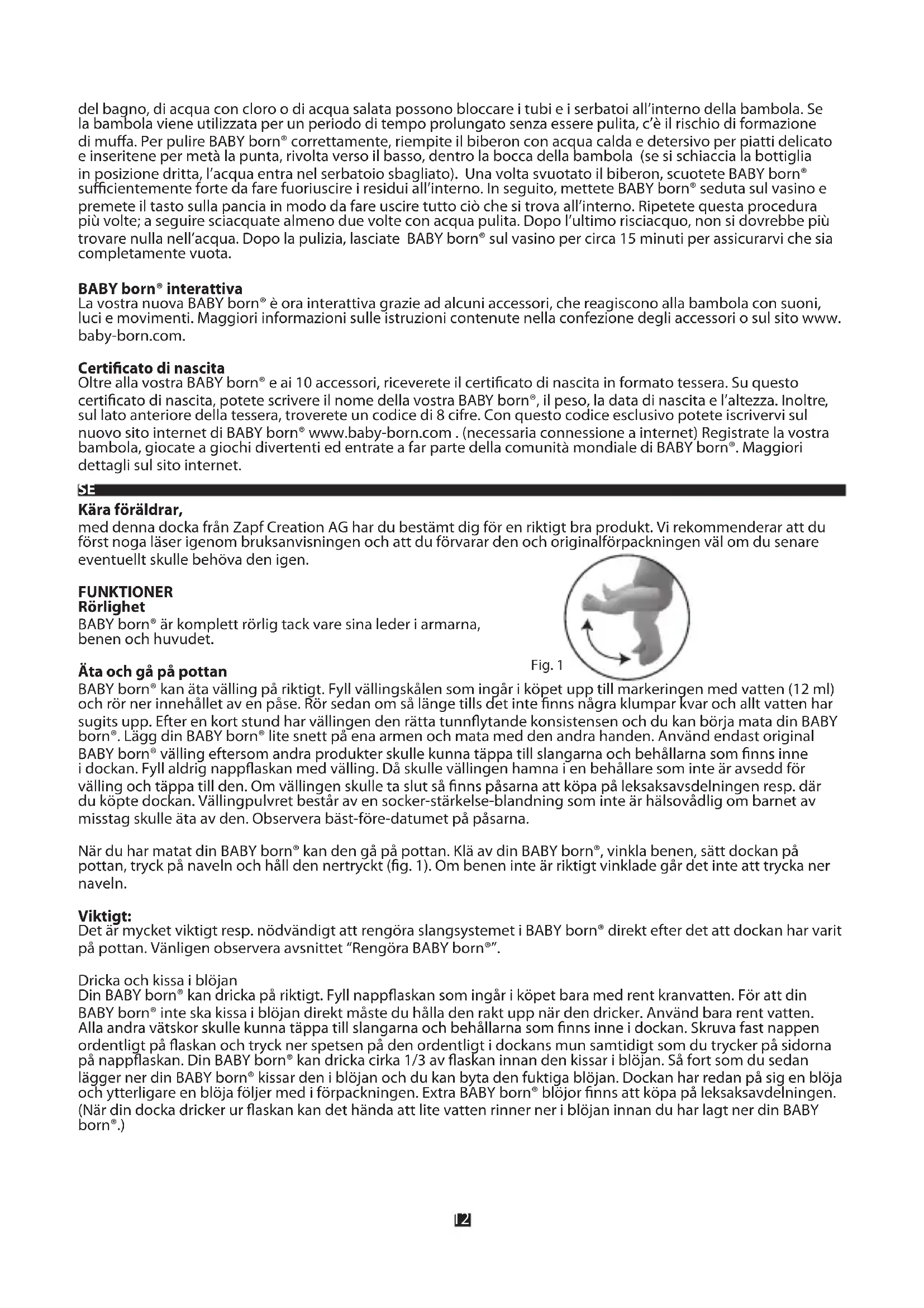 Kära föräldrar, med denna docka från Zapf Creation AG har du bestämt dig för en riktigt bra produkt. Vi rekommenderar att du först noga läser igenom bruksanvisningen och att du förvarar den och originalförpackningen väl om du senare eventuellt skulle behöva den igen. FUNKTIONER Rörlighet BABY born® är komplett rörlig tack vare sina leder i armarna, benen och huvudet. Äta och gå på pottan BABY born® kan äta välling på riktigt. Fyll vällingskålen som ingår i köpet upp till markeringen med vatten (12 ml) och rör ner innehållet av en påse. Rör sedan om så länge tills det inte nns några klumpar kvar och allt vatten har sugits upp. Efter en kort stund har vällingen den rätta tunnytande konsistensen och du kan börja mata din BABY born®. Lägg din BABY born® lite snett på ena armen och mata med den andra handen. Använd endast original BABY born® välling eftersom andra produkter skulle kunna täppa till slangarna och behållarna som nns inne i dockan. Fyll aldrig nappaskan med välling. Då skulle vällingen hamna i en behållare som inte är avsedd för välling och täppa till den. Om vällingen skulle ta slut så nns påsarna att köpa på leksaksavsdelningen resp. där du köpte dockan. Vällingpulvret består av en socker-stärkelse-blandning som inte är hälsovådlig om barnet av misstag skulle äta av den. Observera bäst-före-datumet på påsarna. När du har matat din BABY born® kan den gå på pottan. Klä av din BABY born®, vinkla benen, sätt dockan på pottan, tryck på naveln och håll den nertryckt (g. 1). Om benen inte är riktigt vinklade går det inte att trycka ner naveln. Viktigt: Det är mycket viktigt resp. nödvändigt att rengöra slangsystemet i BABY born® direkt efter det att dockan har varit på pottan. Vänligen observera avsnittet “Rengöra BABY born®”. Dricka och kissa i blöjan Din BABY born® kan dricka på riktigt. Fyll nappaskan som ingår i köpet bara med rent kranvatten. För att din BABY born® inte ska kissa i blöjan direkt måste du hålla den rakt upp när den dricker. Använd bara rent vatten. Alla andra vätskor skulle kunna täppa till slangarna och behållarna som nns inne i dockan. Skruva fast nappen ordentligt på askan och tryck ner spetsen på den ordentligt i dockans mun samtidigt som du trycker på sidorna på nappaskan. Din BABY born® kan dricka cirka 1/3 av askan innan den kissar i blöjan. Så fort som du sedan lägger ner din BABY born® kissar den i blöjan och du kan byta den fuktiga blöjan. Dockan har redan på sig en blöja och ytterligare en blöja följer med i förpackningen. Extra BABY born® blöjor nns att köpa på leksaksavdelningen. (När din docka dricker ur askan kan det hända att lite vatten rinner ner i blöjan innan du har lagt ner din BABY born®.) Fig. 113 Gråta Om du trycker era gånger på den högra armen på din BABY born® kan den gråta riktiga tårar (dockan måste emellertid först ha druckit vatten ur sin nappaska). Bada Din BABY born® kan vara med dig när du badar i badkaret eller när du plaskar i simbassängen. Den ska emellertid inte doppas ner helt i vattnet. När du är ute är det viktigt att din BABY born® inte ligger för länge direkt i solen (högst 1 timme). Kontrollera att vridlåset som nns på ryggen på din BABY born® är stängt innan dockan badar (spåret i vridlåset ska stå lodrätt). Bada dockan bara i kallt eller ljummet vatten och använd bara vanliga badtillsatser för barn. Lek inte med din BABY born® i mer än 3 timmar i bad-, klor och saltvatten, eftersom man annars inte kan utesluta kemiska reaktioner respektive att materialet bleknar. Rengör din BABY born® när den har badat med rent kranvatten. Om det ändå skulle hända att vatten hamnar i dockar när den badar så kan man torka BABY born® på följande sätt: Öppna vridlåset på ryggen på din BABY born® försiktigt med en skruvdragare eller ett mynt (moturs) och dra sedan ut det ett litet stycke. Observera att vridlåset inte går att ta bort helt! Försök sedan att få ut vattnet genom att röra dockan försiktig fram och tillbaka era gånger (medan den ligger på ryggen). Upprepa detta era gånger om det behövs. Om det skulle vara vattenrester kvar så kan man också låta dockan ligga med öppet vridlås i 2-3 timmar så att vattnet kan försvinna. Stäng sedan vridlåset medurs igen när dockan har torkat. Viktigt: