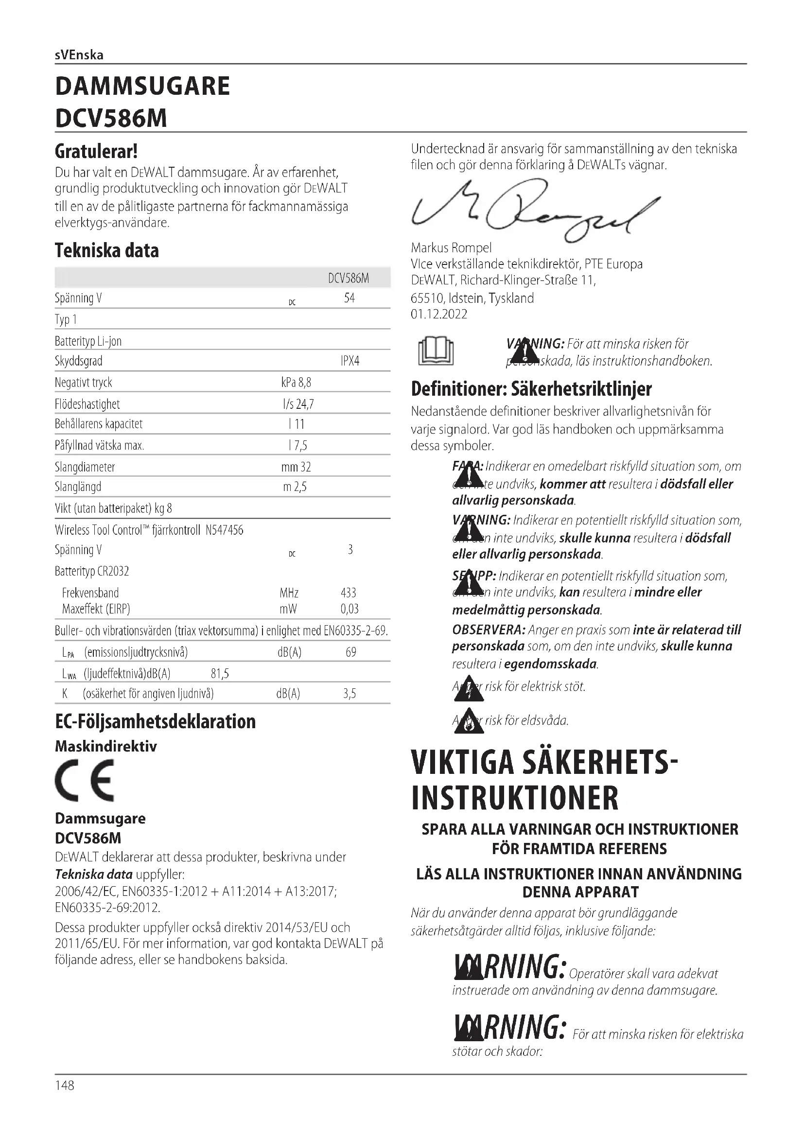 (ljudeffektnivå) dB(A) 81,5 K (osäkerhet för angiven ljudnivå) dB(A) 3,5 EC‑Följsamhetsdeklaration Maskindirektiv Dammsugare DCV586M DeWALT deklarerar att dessa produkter, beskrivna under Tekniska data uppfyller: 2006/42/EC, EN60335‑1:2012 + A11:2014 + A13:2017; EN60335‑2‑69:2012.Dessa produkter uppfyller också direktiv 2014/53/EU och 2011/65/EU. För mer information, var god kontakta DeWALT på följande adress, eller se handbokensbaksida. DAMMSUGARE DCV586M Svenska (översatt från de ursprungliga instruktionerna)149 sVEnska