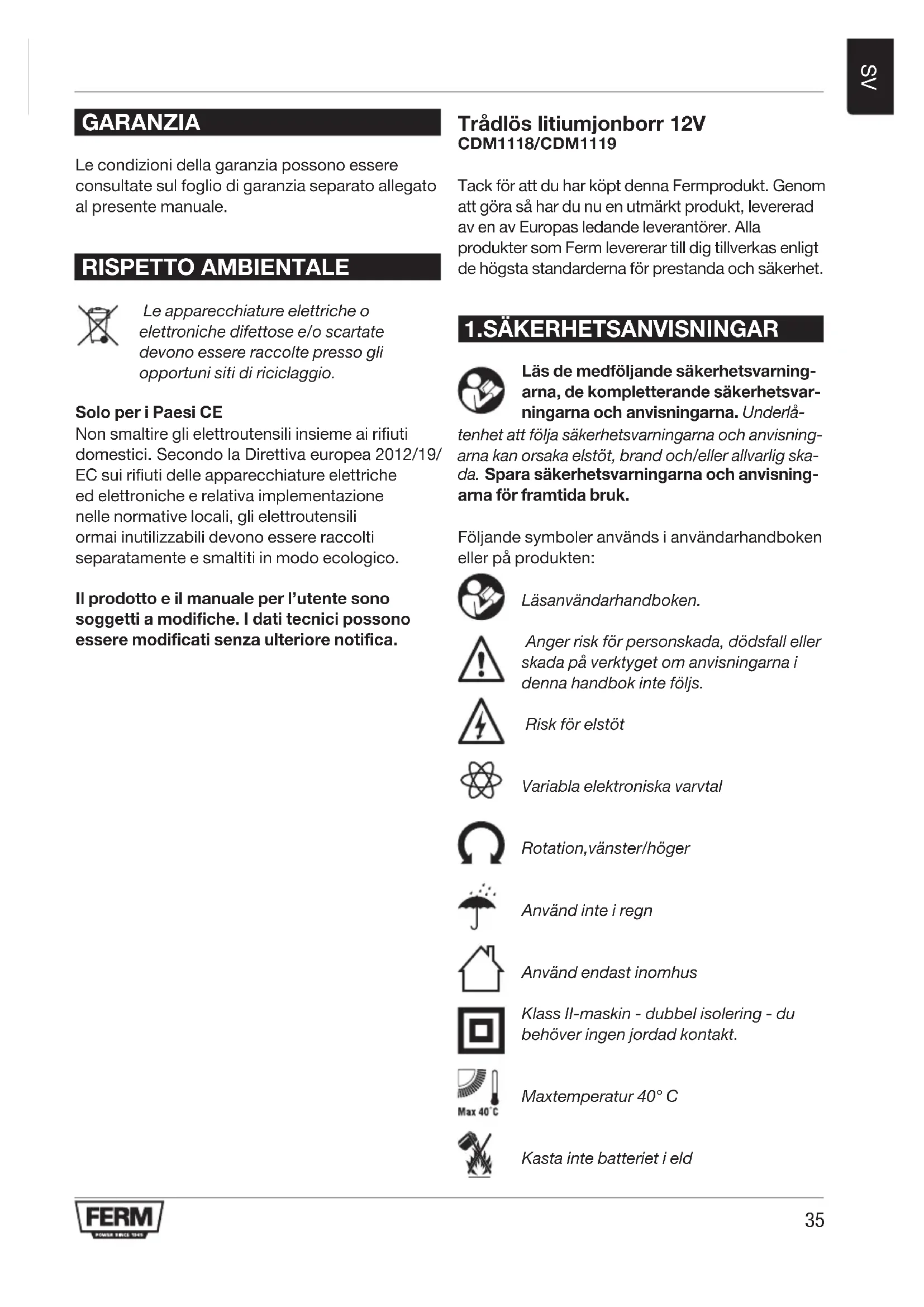 Stäng alltid av maskinen och ta ut batteripaketet från maskinen innan underhåll. Rengörmaskinenhusregelbundetmeden mjuk trasa, helst efter varje gång du använder maskinen.Setillattventilationsöppningarna är fria från damm och smuts. Ta bort mycket ihållande smuts med en mjuk trasa fuktad med tvållösning. Använd inte lösningsmedel sombensin,alkohol,ammoniakosv.Sådana kemikalier skadar de syntetiska komponenterna. GARANTI Garantivillkoren finns på separat medföljande garantikort. MILJÖ Felaktig och/eller kasserad elektrisk eller elektronisk utrustning måste lämnas in på lämpliga återvinningsstationer. Endast för EU-länder Kassera inte elverktyg i hushållsavfall. Enligt den europeiska riktlinjen 2012/19/EC om kasserad elektrisk och elektronisk utrustning och dess tillämpning i nationell rätt måste elverktyg som inte längre är användbara samlas in separat och kasseras på ett miljövänligt sätt. Produkten och användarhandboken kan ändras. Specifikationerna kan ändras utan förvarning. Langaton litiumioniakulla toimiva pora 12 V CDM1118/CDM1119 Kiitämme tämän Ferm-tuotteen hankkimisesta. Olette hankkineet erinomaisen tuotteen, jonka tarjoaa yksi Euroopan johtavista toimittajista. Kaikki Fermin valmistamat tuotteet on valmistettu korkeimpien suorituskykyä ja turvallisuutta koskevien standardien mukaisesti.