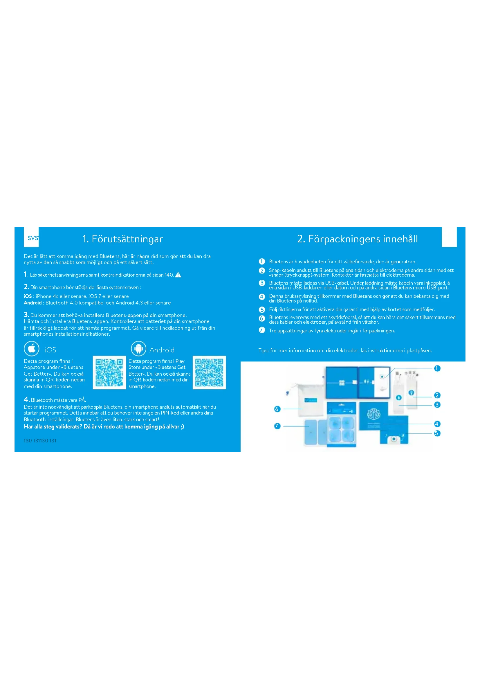128128Bluetens är huvudenheten för ditt välbefinnande, den är generatorn. Snap-kabeln ansluts till Bluetens på ena sidan och elektroderna på andra sidan med ett «snap» (tryckknapp)-system. Kontakter är fastsatta till elektroderna. Bluetens måste laddas via USB-kabel. Under laddning måste kabeln vara inkopplad, å ena sidan i USB-laddaren eller datorn och på andra sidan i Bluetens micro USB-port. Denna bruksanvisning tillkommer med Bluetens och gör att du kan bekanta dig med din Bluetens på nolltid. Följ riktlinjerna för att aktivera din garanti med hjälp av kortet som medföljer. Bluetens levereras med ett skyddsfodral, så att du kan bära det säkert tillsammans med dess kablar och elektroder, på avstånd från vätskor. Tre uppsättningar av fyra elektroder ingår i förpackningen. Tips: för mer information om din elektroder, läs instruktionerna i plastpåsen.