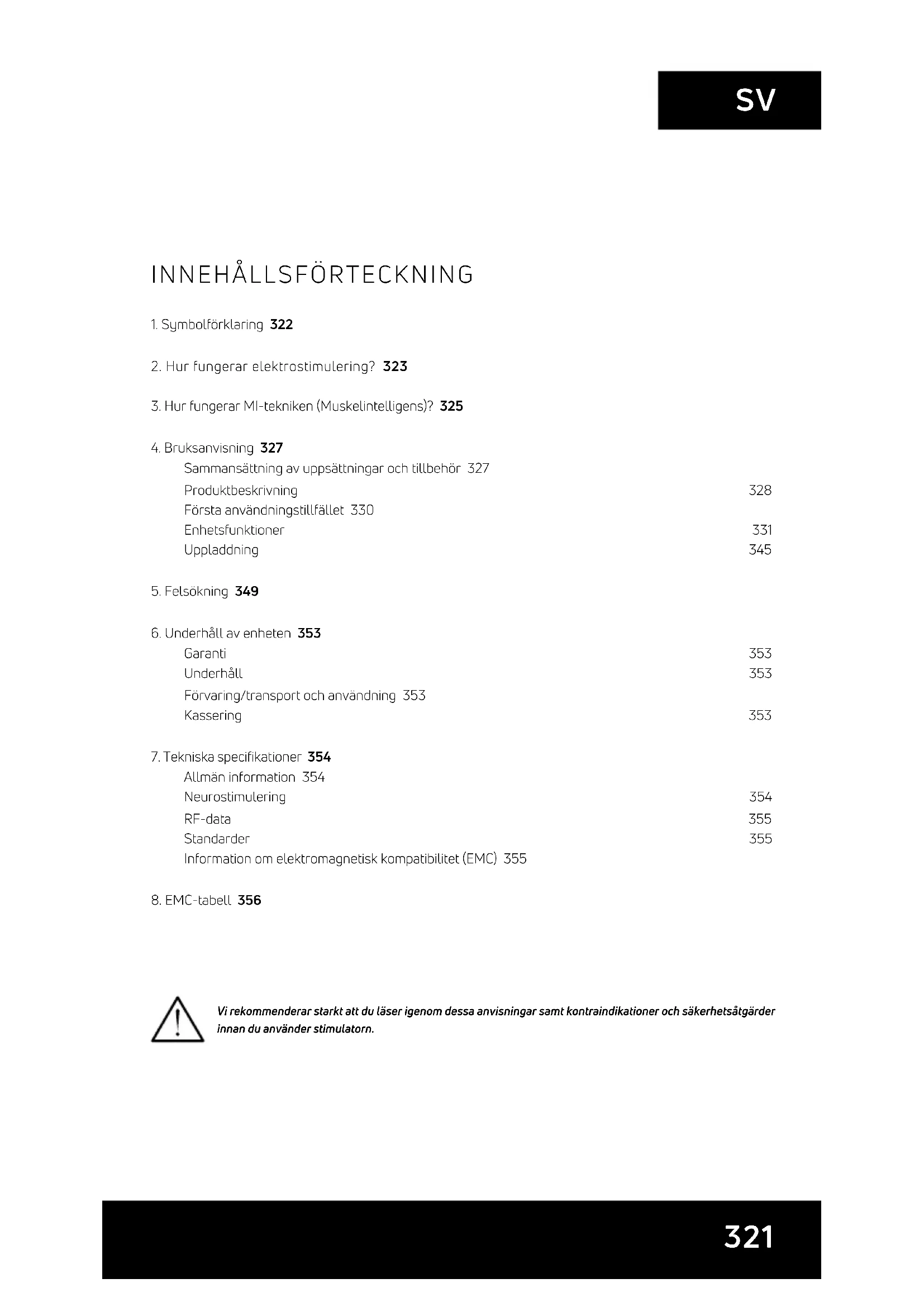 - Om apparaten trots detta inte fungerar ska du kontakta kundtjänst som angivits och godkänts av Compex.353