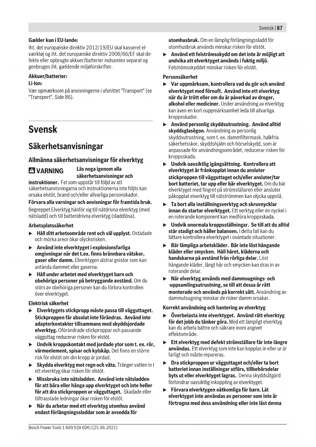 De angivne værdier for hastighedstrin er vejledende værdier. u Tilbehørets mærkehastighed skal minimum svare til den maks. hastighed, der er angivet på el-værktøjet. Tilbehør, der anvendes ved en højere hastighed end mær- kehastigheden, kan gå i stykker og slynges af værktøjet. Arbejdsvejledning u Forsigtig ved slidsning i bærende vægge, se afsnittet "Oplysninger om statik". u Fastspænd emnet, hvis det ikke ligger sikkert på grund af sin egenvægt. u Belast ikke el-værktøjet så meget, at det kommer til stilstand. u Lad el-værktøjet køre i tomgang i et par minutter efter stærk belastning, så indsatsværktøjet kan afkøle. u El-værktøjet må ikke benyttes med en skærestander. u Rør ikke ved slibe- og skæreskiverne, før de er kølet af. Skiverne bliver meget varmt under arbejdet. Skrubslibning u Anvend aldrig skæreskiver til skrubslibning. Med en hældningsvinkel på 30° til 40° opnår du det bedste arbejdsresultat ved skrubslibning. Bevæg el-værktøjet frem og tilbage med et moderat tryk. Derved undgår du, at emnet bliver for varmt, at det misfarves, eller at der opstår riller. Lamelslibeskive Med lamelslibeskiven (tilbehør) kan du også bearbejde hvæl- vede overflader og profiler. Lamelslibeskiver har en væsentligt længere levetid, lavere støjniveau og lavere slibetemperaturer end normale slibeski- ver. Skæring af metal u Brug altid en beskyttelseskappe til skæring ved gen- nemskæring med bundne slibemidler (13). Ved skæring skal der arbejdes med en jævn fremføring, som er afstemt efter materialet, der bearbejdes. Skæreskiven må ikke påføres tryk, komme i spænd eller udsættes for sving- ninger. Udløbende skæreskiver må ikke bremses ved at trykke på si- den. Bosch Power Tools 1 609 92A 6D6 | (25.06.2021)86 | Dansk El-værktøjet skal altid føres i modløb. Ellers er der risiko for, at det ukontrolleret trykkes ud af snittet. Ved skæring af profiler og firkantrør er det bedst at starte ved det mindste tværsnit. Skæring af sten (se billede A) u Sørg for tilstrækkelig støvopsugning, når der skæres i sten. u Brug beskyttelsesmaske. u El-værktøjet må kun anvendes til tørskæring/tørslib- ning. Brug så vidt muligt en diamantskæreskive til overskæring af sten. Ved anvendelse af udsugningsskærmen til skæring med fø- ringsslæde (24) skal støvsugeren være godkendt til udsug- ning af stenstøv. Bosch tilbyder egnede støvsugere. Start el-værktøjet, og sæt det på emnet med den for- reste del af føringsslæden. Skub el-værktøjet med et moderat tryk, tilpasset til materialet der skal bear- bejdes. Ved skæring af særligt hår- de materialer, f.eks. beton med højt kiselindhold, kan diamantskæreskiven blive overophedet og derved tage skade. En krans af gnister, der følger den omløbende dia- mantskæreskive, er et tydeligt tegn på dette. I så fald skal du afbryde skærearbejdet og lade diamantskæ- reskiven køre kort tid i tomgang ved det højeste omdrej- ningstal for at afkøle den. Hvis arbejdet skrider mærkbart langsommere frem, og der dannes en lysende krans af gnister, er det tegn på, at dia- mantskæreskiven er blevet sløv. Du kan slibe den igen ved at udføre korte snit i et slibende materiale, f.eks. kalksandsten. Oplysninger om statik Slidser i bærende vægge er omfattet af standarden DIN1053 del 1 eller landespecifikke bestemmelser. Disse forskrifter skal altid overholdes. Før arbejdet påbegyndes, skal den ansvarlige statiker, arkitekt eller byggeledelse spør- ges til råds. Oplysninger om optimal håndtering af akkuen Beskyt akkuen mod fugtighed og vand. Opbevar kun akkuen i et temperaturområde fra –20 °C til 50 °C. Opbevar ikke akkuen i bilen f. eks. om sommeren. Rengør akkuens ventilationsåbninger en gang imellem med en blød, ren og tør pensel. Når driftstiden pr. opladning forkortes væsentligt, er det tegn på, at akkuerne er slidt op og skal udskiftes. Læs og overhold henvisningerne mht. bortskaffelse. Vedligeholdelse og service Vedligeholdelse og rengøring u Tag altid akkuen ud af el‑værktøjet, før der arbejdes på el‑værktøjet (f.eks. vedligeholdelse, værktøjsskift osv.) samt før det transporteres og lægges til opbeva- ring. Utilsigtet aktivering af start-stop-kontakten er for- bundet med kvæstelsesfare. u El‑værktøj og el‑værktøjets ventilationsåbninger skal altid holdes rene for at sikre et godt og sikkert ar- bejde. Opbevar og behandle tilbehøret omhyggeligt. Kundeservice og anvendelsesrådgivning Kundeservice besvarer dine spørgsmål vedr. reparation og vedligeholdelse af dit produkt samt reservedele. Eksplo- sionstegninger og oplysninger om reservedele finder du også på: www.bosch-pt.com Bosch-anvendelsesrådgivningsteamet hjælper dig gerne, hvis du har spørgsmål til produkter og tilbehørsdele. Produktets 10‑cifrede typenummer (se typeskilt) skal altid angives ved forespørgsler og bestilling af reservedele. Dansk Bosch Service Center Telegrafvej 3 2750 Ballerup På www.bosch-pt.dk kan der online bestilles reservedele el- ler oprettes en reparations ordre. Tlf. Service Center: 44898855 Fax: 44898755 E-Mail: vaerktoej@dk.bosch.com Du finder adresser til andre værksteder på: www.bosch-pt.com/serviceaddresses Transport De indeholdte Li-Ion-akkuer overholder bestemmelserne om farligt gods. Akkuerne kan transporteres af brugeren på of- fentlig vej uden yderligere pålæg. Ved forsendelse gennem tredjemand (f.eks.: lufttransport el- ler spedition) skal særlige krav vedr. emballage og mærkning overholdes. Her skal man kontakte en faregodsekspert, før forsendelsesstykket forberedes. Send kun akkuer, hvis huset er ubeskadiget. Tilklæb åbne kontakter, og indpak akkuen på en sådan måde, at den ikke kan bevæge sig i emballagen. Følg venligst også eventuelle, videreførende, nationale forskrifter. Bortskaffelse El-værktøj, akku, tilbehør og emballage skal genbruges på en miljøvenlig måde. Smid ikke el-værktøj og akkuer/batteri