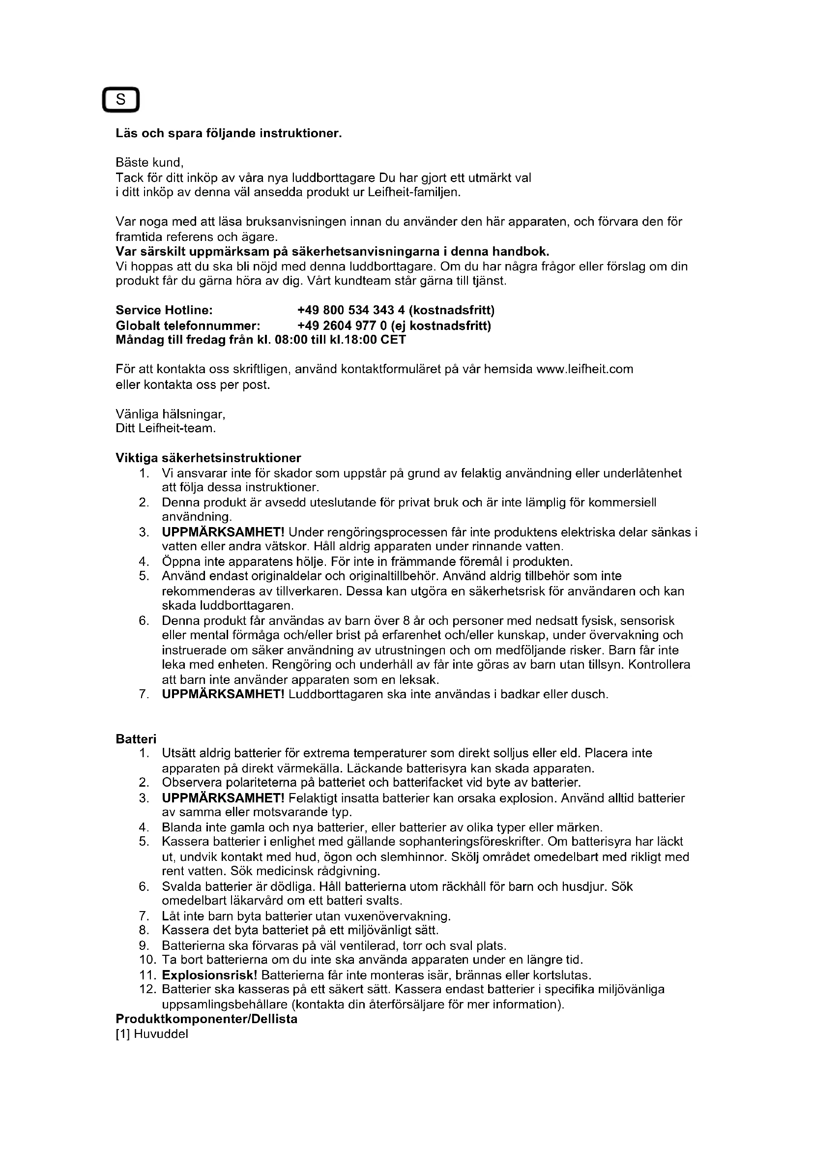 12. Batterier ska kasseras på ett säkert sätt. Kassera endast batterier i specifika miljövänliga