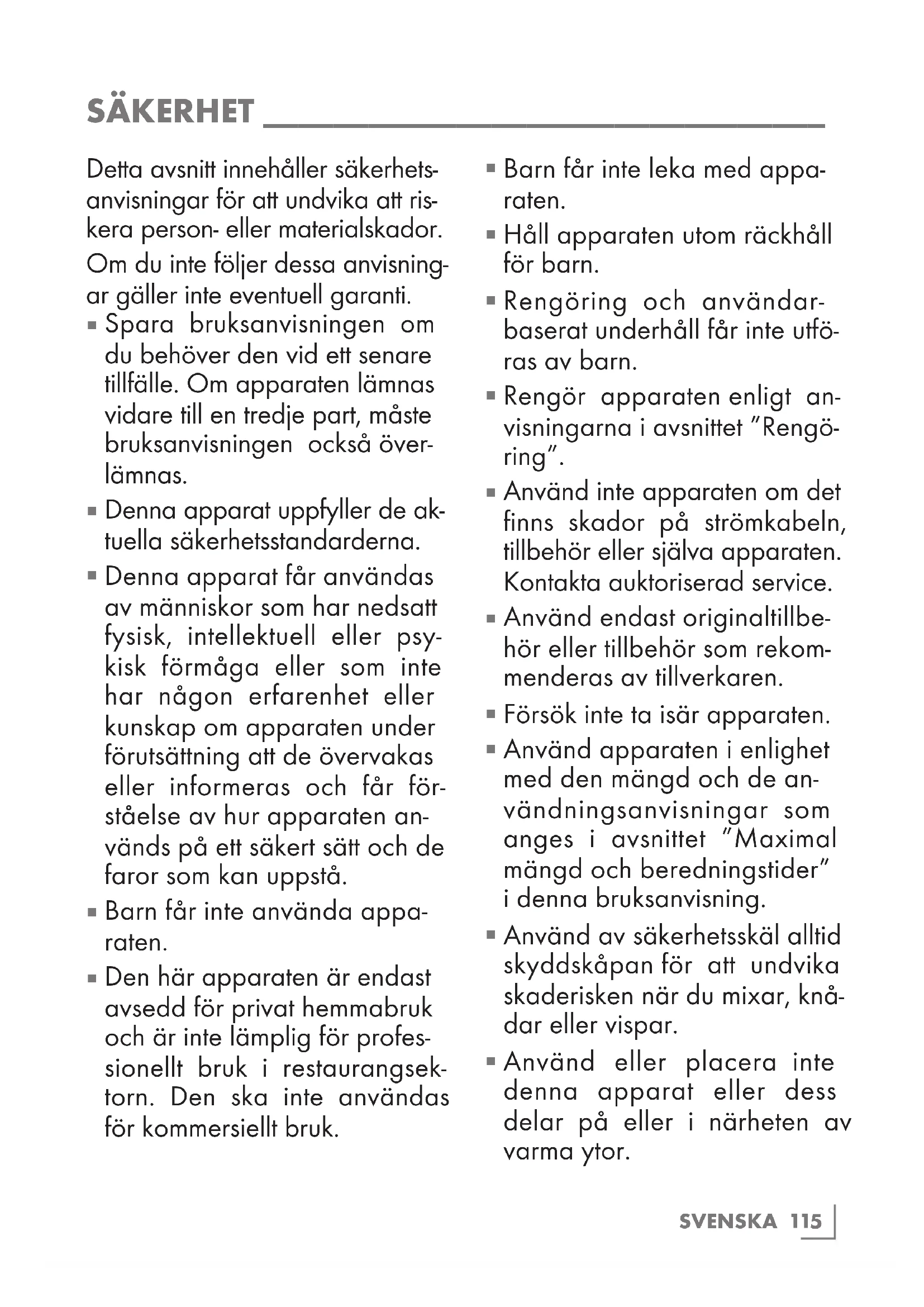 50–60 Hz Effekt: 1000 W Med forbehold om konstruksjonsendringer og tekniske endringer.SVENSKA 115 Detta avsnitt innehåller säkerhets- anvisningar för att undvika att ris- kera person- eller materialskador. Om du inte följer dessa anvisning- ar gäller inte eventuell garanti.