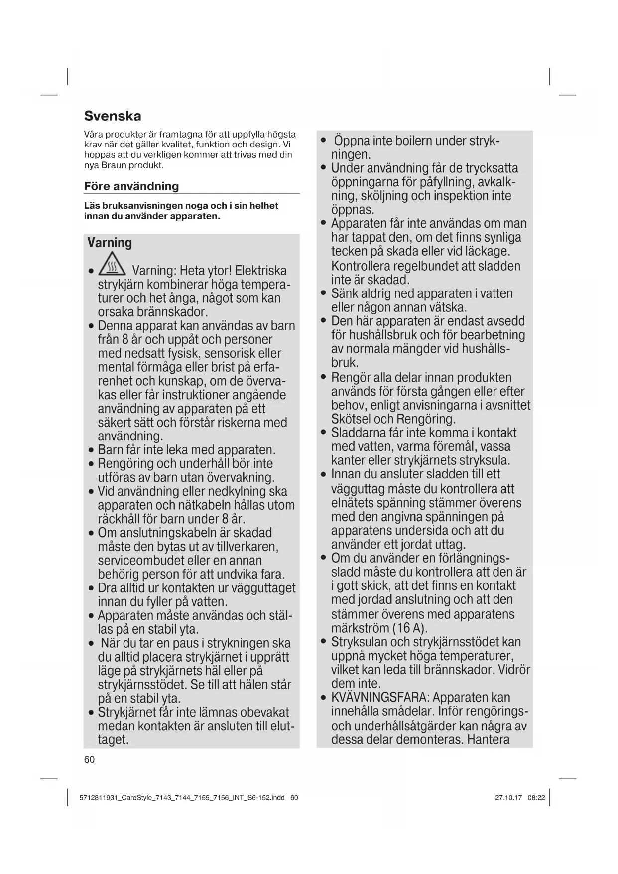 Vattenfl ottören fungerar inte korrekt. Töm vattenbehållaren, skölj ur den och fyll på nytt vatten. Vattenbehållaren är inte placerad på korrekt sätt. Placera vattenbehållaren på korrekt sätt. 5712811931_CareStyle_7143_7144_7155_7156_INT_S6-152.indd 645712811931_CareStyle_7143_7144_7155_7156_INT_S6-152.indd 64 27.10.17 08:2227.10.17 08:2265 Alla lysdioder blinkar. Systemfel. Dra ur kontakten, sätt in den igen och tryck ner På/Av-knappen. Om problemet kvarstår ska du stänga av apparaten omedelbart och kontakta Brauns auktoriserade kundtjänst. Ikonen för ånga är tänd hela tiden, men det kommer inte någon ånga från stryksulan. Flottören i vattenbehållaren har fastnat, eller vattenbehållaren är inte placerad på korrekt sätt. Stäng av apparaten och dra ur kontakten. Ta loss och töm vattenbehållaren, skölj ur den och fyll på nytt vatten. Sätt tillbaka vattenbehållaren. Sätt på apparaten och vänta tills enheten är färdigt att användas. Tryck ner ångknappen och vänta tills det kommer ut ånga. Håll ångknappen nertryckt, låt ångan strömma ut i 10 sekunder och släpp sedan ångknappen. Ånga eller vatten sipprar ut vid förslutningslocket. Förslutningslocket är inte ordentligt fastskruvat. Stäng av apparaten, dra ut kontakten och låt apparaten svalna (i minst 2,5 timmar). Skruva loss förslutningslocket och skruva tillbaka det ordentligt på apparaten. OBS: Vatten kan rinna ut när du skruvar loss förslutningslocket. Den dubbla sladden blir varm under användning. Detta är normalt. Det orsakas av att ångan passerar genom sladden under strykningen. Placera den dubbla sladden på motsatt sida så att du inte kan vidröra den medan du stryker. 5712811931_CareStyle_7143_7144_7155_7156_INT_S6-152.indd 655712811931_CareStyle_7143_7144_7155_7156_INT_S6-152.indd 65 27.10.17 08:2227.10.17 08:2266 Suomi Tuotteemme on suunniteltu täyttämään korkeimmat laadun, toimivuuden ja muotoilun vaatimukset. Toivomme, että uudesta Braun - tuotteestasi on Sinulle paljon hyötyä. Ennen käyttöä Lue käyttöohjeet huolellisesti ja kokonaan ennen laitteen käyttöä. Varoitus