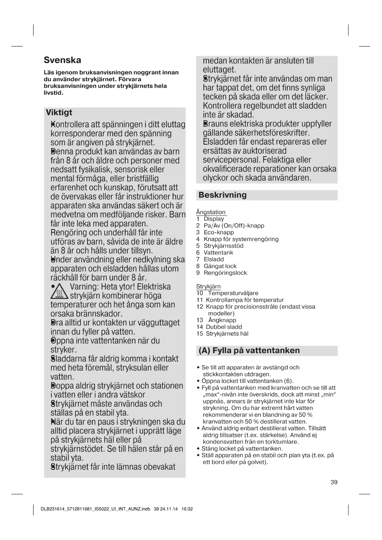 DLB231614_5712811681_IS5022_UI_INT_AUNZ.indb 38 24.11.14 16:32Svenska Läs igenom bruksanvisningen noggrant innan du använder strykjärnet. Förvara bruksanvisningen under strykjärnets hela livstid. Viktigt