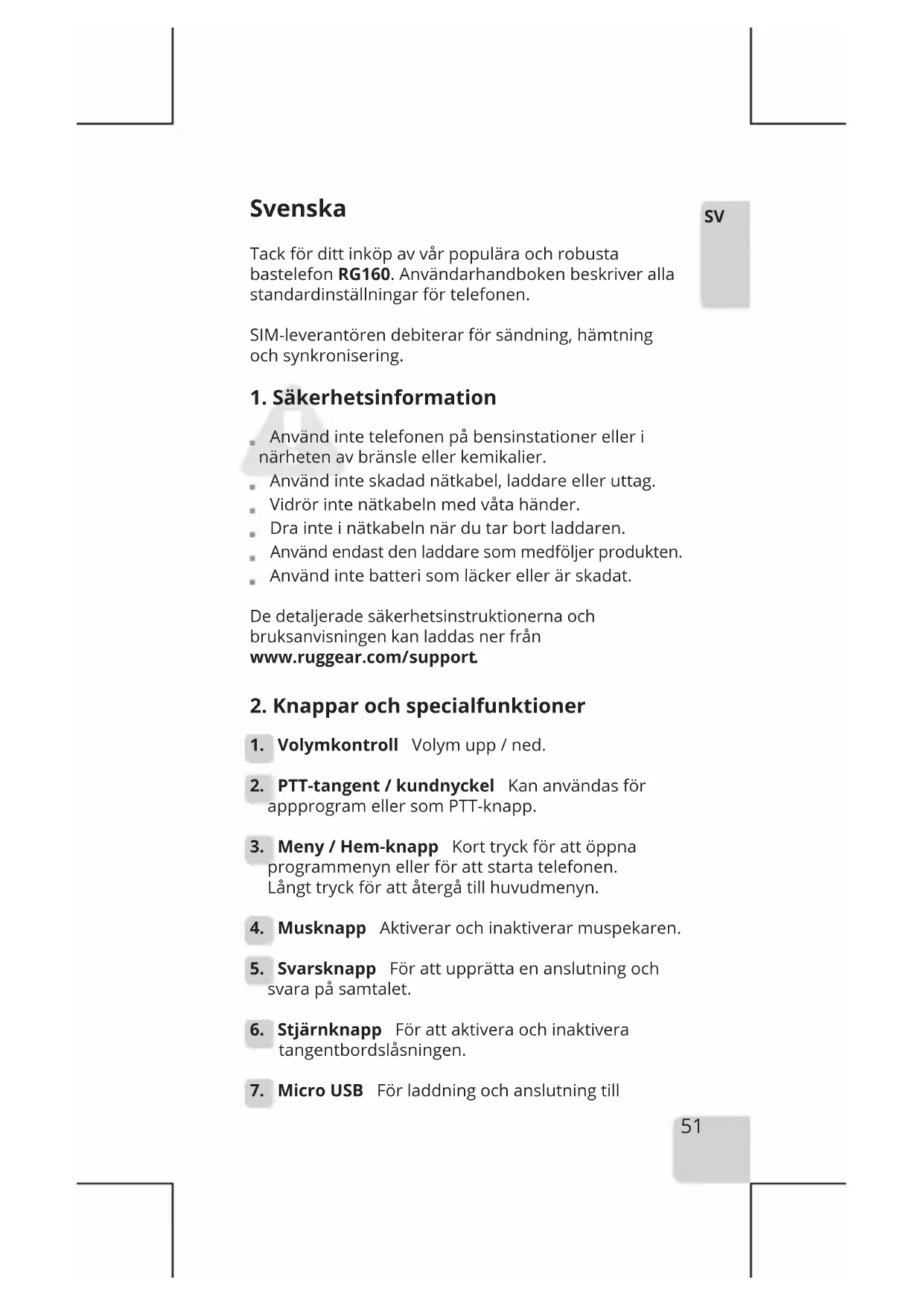 Använd inte telefonen på bensinstationer eller i närheten av bränsle eller kemikalier. Använd inte skadad nätkabel, laddare eller uttag. Vidrör inte nätkabeln med våta händer. Dra inte i nätkabeln när du tar bort laddaren. Använd endast den laddare som medföljer produkten. Använd inte batteri som läcker eller är skadat. De detaljerade säkerhetsinstruktionerna och bruksanvisningen kan laddas ner från www.ruggear.com/ support