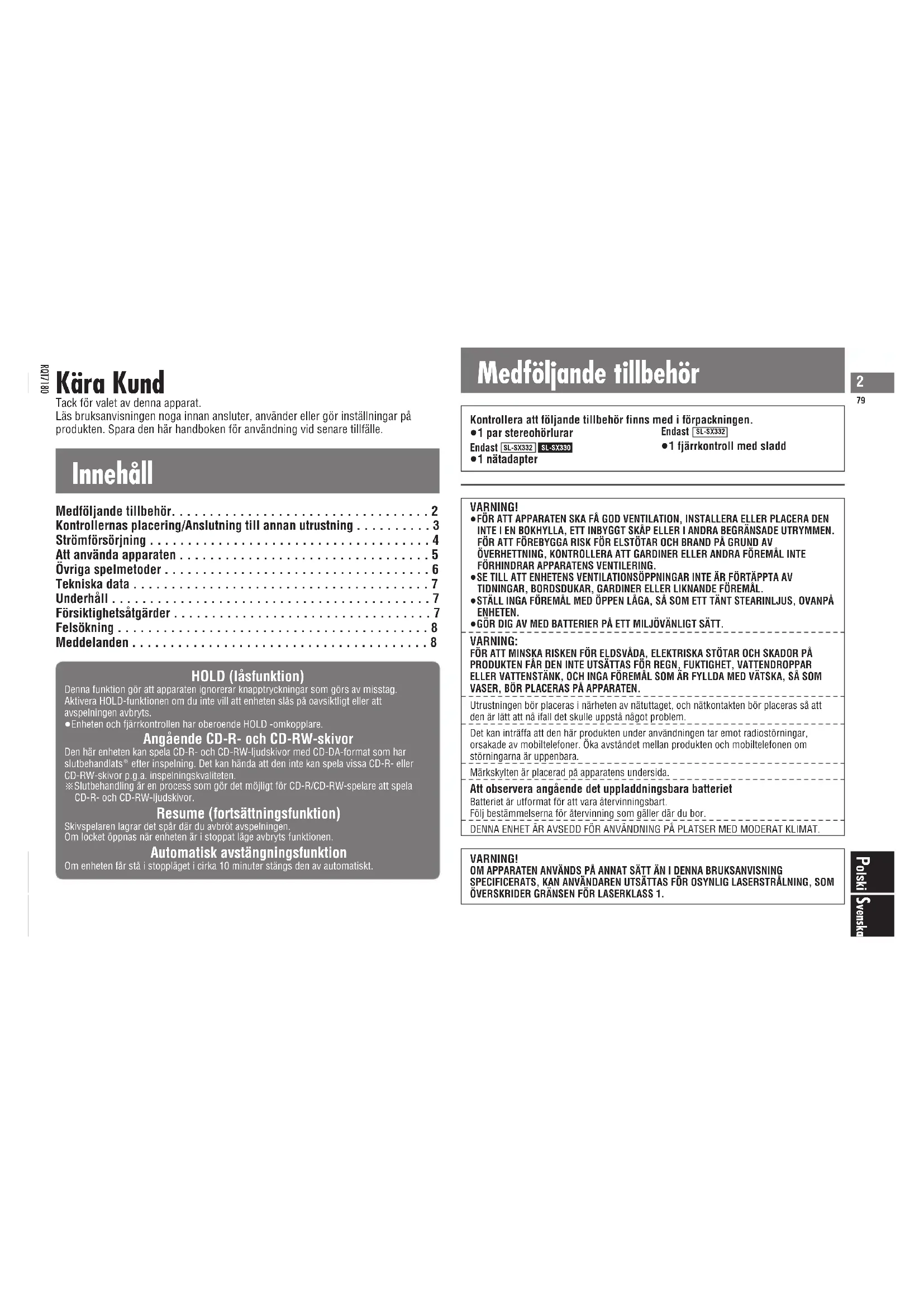 - olski ≥1 par stereohörlurar Endast ≥1 nätadapter Endast ≥1 fjärrkontroll med sladd SL-SX332SL-SX330SL-SX332 Innehåll Kära Kund Tack för valet av denna apparat. Läs bruksanvisningen noga innan ansluter, använder eller gör inställningar på produkten. Spara den här handboken för användning vid senare tillfälle. HOLD (låsfunktion) Denna funktion gör att apparaten ignorerar knapptryckningar som görs av misstag.Aktivera HOLD-funktionen om du inte vill att enheten slås på oavsiktligt eller att avspelningen avbryts.≥Enheten och fjärrkontrollen har oberoende HOLD -omkopplare. Angående CD-R- och CD-RW-skivor Den här enheten kan spela CD-R- och CD-RW-ljudskivor med CD-DA-format som har slutbehandlats efter inspelning. Det kan hända att den inte kan spela vissa CD-R- eller CD-RW-skivor p.g.a. inspelningskvaliteten. §Slutbehandling är en process som gör det möjligt för CD-R/CD-RW-spelare att spela CD-R- och CD-RW-ljudskivor. Resume (fortsättningsfunktion) Skivspelaren lagrar det spår där du avbröt avspelningen.Om locket öppnas när enheten är i stoppat läge avbryts funktionen. Automatisk avstängningsfunktion Om enheten får stå i stoppläget i cirka 10 minuter stängs den av automatiskt. Medföljande tillbehör Medföljande tillbehör p. 2