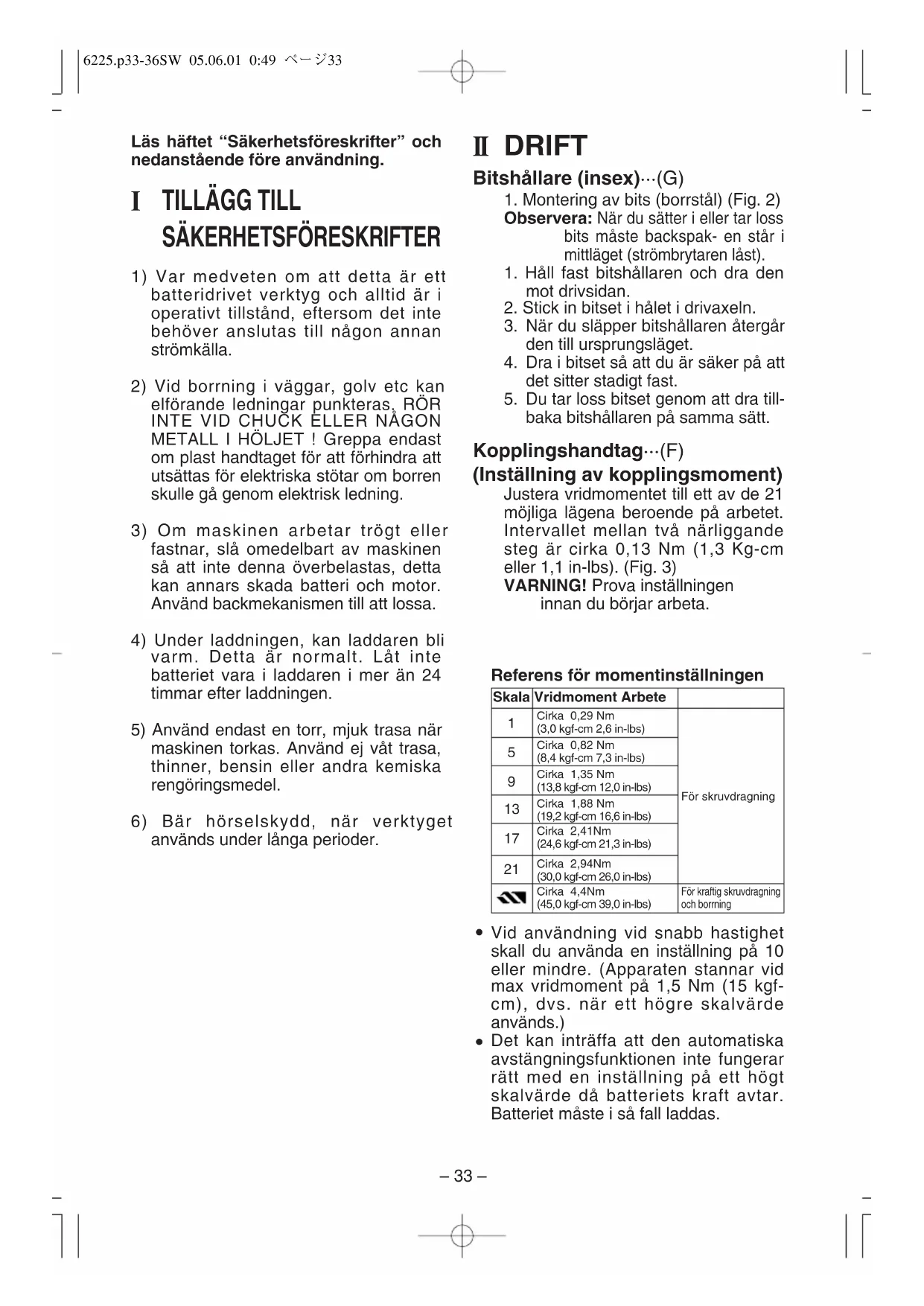 | Cirka 4,4Nm(45,0 kgf-cm 39,0 in-lbs) | För kraftig skruvdragning och borming |