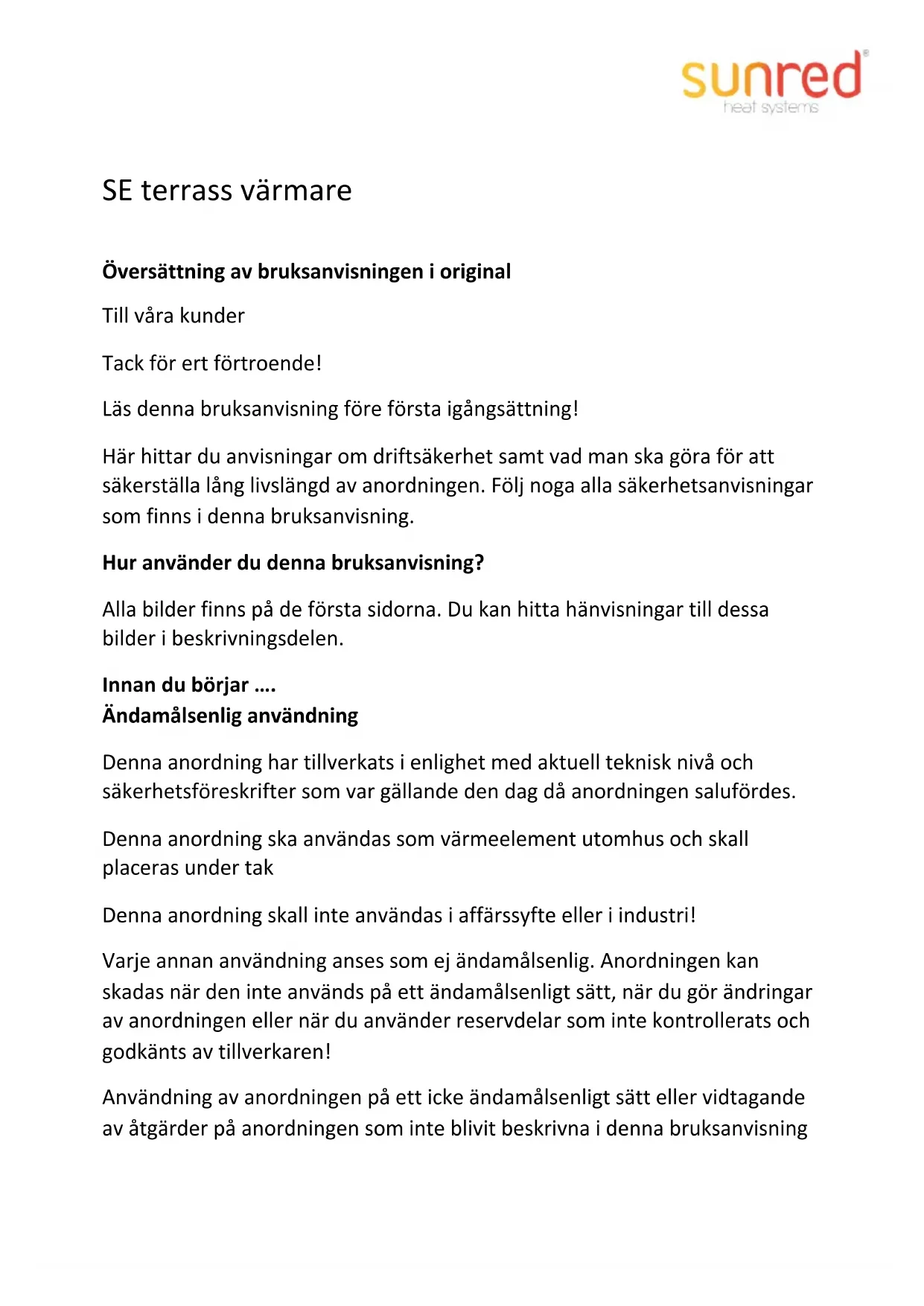 - Det er forbudt at fjerne eller tildække symboler på udstyret. Ulæselige informationsskilte på udstyret udskiftes omgående. Rengøring – Udstyret slukkes for og lades køle helt ned. – Stikket udtages fra kontakten. – Udstyret rengøres vha. en lettere fugtig klud. – Til rengøring af varmelegemer og lygter anvendes en pensel med langt, blødt hår.Bortskaffelse Bortskaffelse af udstyret Udstyr, der er markeret med symbolet vist ved siden af, må ikke bortskaffes med husholdningsaffald. Gamle elektriske og elektroniske apparater bortskaffes særskilt. Takket være bortskaffelsen bliver udstyret genbrugt eller genanvendt i en anden form. Dermed forhindres eventuel udledning af forurenende stoffer til miljøet. Bortskaffelse af emballagen Emballagen består af karton og hensigtsmæssig mærket plast, der egner sig til genbrug. – Materialerne afleveres til et genbrugscenter mhp. genbrug.SE terrass värmare Översättning av bruksanvisningen i original Till våra kunder Tack för ert förtroende! Läs denna bruksanvisning före första igångsättning! Här hittar du anvisningar om driftsäkerhet samt vad man ska göra för att säkerställa lång livslängd av anordningen. Följ noga alla säkerhetsanvisningar som finns i denna bruksanvisning. Hur använder du denna bruksanvisning? Alla bilder finns på de första sidorna. Du kan hitta hänvisningar till dessa bilder i beskrivningsdelen. Innan du börjar …. Ändamålsenlig användning Denna anordning har tillverkats i enlighet med aktuell teknisk nivå och säkerhetsföreskrifter som var gällande den dag då anordningen salufördes. Denna anordning ska användas som värmeelement utomhus och skall placeras under tak Denna anordning skall inte användas i affärssyfte eller i industri! Varje annan användning anses som ej ändamålsenlig. Anordningen kan skadas när den inte används på ett ändamålsenligt sätt, när du gör ändringar av anordningen eller när du använder reservdelar som inte kontrollerats och godkänts av tillverkaren! Användning av anordningen på ett icke ändamålsenligt sätt eller vidtagande av åtgärder på anordningen som inte blivit beskrivna i denna bruksanvisninginnebär en olaglig användning och leder till att tillverkaren frigörs från garantiansvaret. För din säkerhet Allmänna säkerhetsföreskrifter