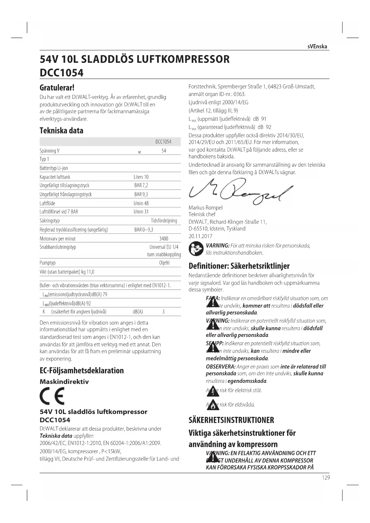 (garanterad ljudeffektnivå) dB 92 Dessa produkter uppfyller också direktiv 2014/30/EU, 2014/29/EU och 2011/65/EU. För mer information, var god kontakta DeWALT på följande adress, eller se handbokensbaksida. Undertecknad är ansvarig för sammanställning av den tekniska filen och gör denna förklaring å DeWALT svägnar. Markus Rompel Teknisk chef DeWALT , Richard‑Klinger‑Straße 11, D‑65510, Idstein, Tyskland