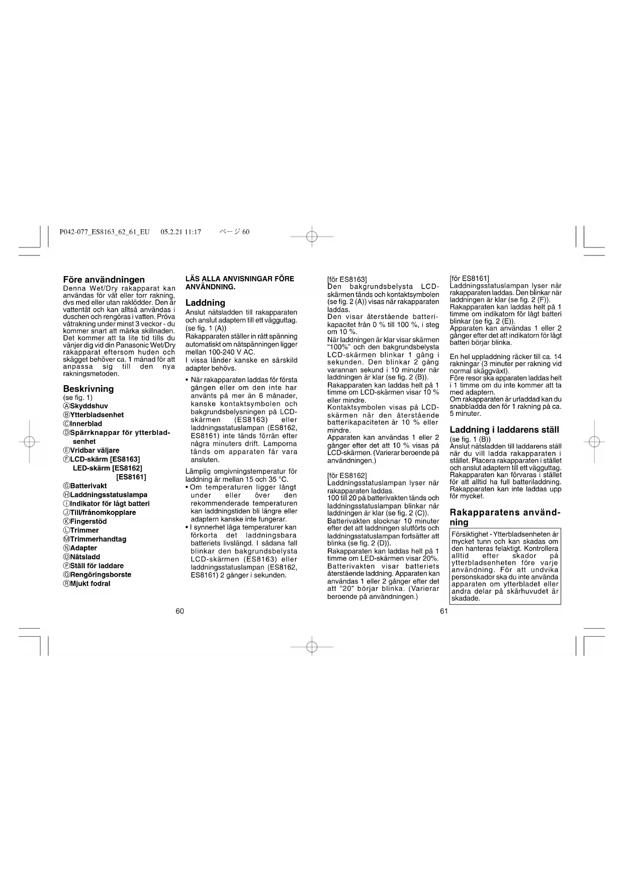 Före användningen Denna Wet/Dry rakapparat kan användas för våt eller torr rakning, dvs med eller utan raklödder. Den är vattentät och kan alltså användas i duschen och rengöras i vatten. Pröva våtrakning under minst 3 veckor - du kommer snart att märka skillnaden. Det kommer att ta lite tid tills du vänjer dig vid din Panasonic Wet/Dry rakapparat eftersom huden och skägget behöver ca. 1 månad för att anpassa sig till den nya rakningsmetoden. Beskrivning (se fig. 1) A Skyddshuv B Ytterbladsenhet C Innerblad D Spärrknappar för ytterblad- senhet E Vridbar väljare F LCD-skärm [ES8163] LED-skärm [ES8162] [ES8161] G Batterivakt H Laddningsstatuslampa I Indikator för lågt batteri J Till/frånomkopplare K Fingerstöd L Trimmer M Trimmerhandtag N Adapter O Nätsladd P Ställ för laddare Q Rengöringsborste R Mjukt fodral