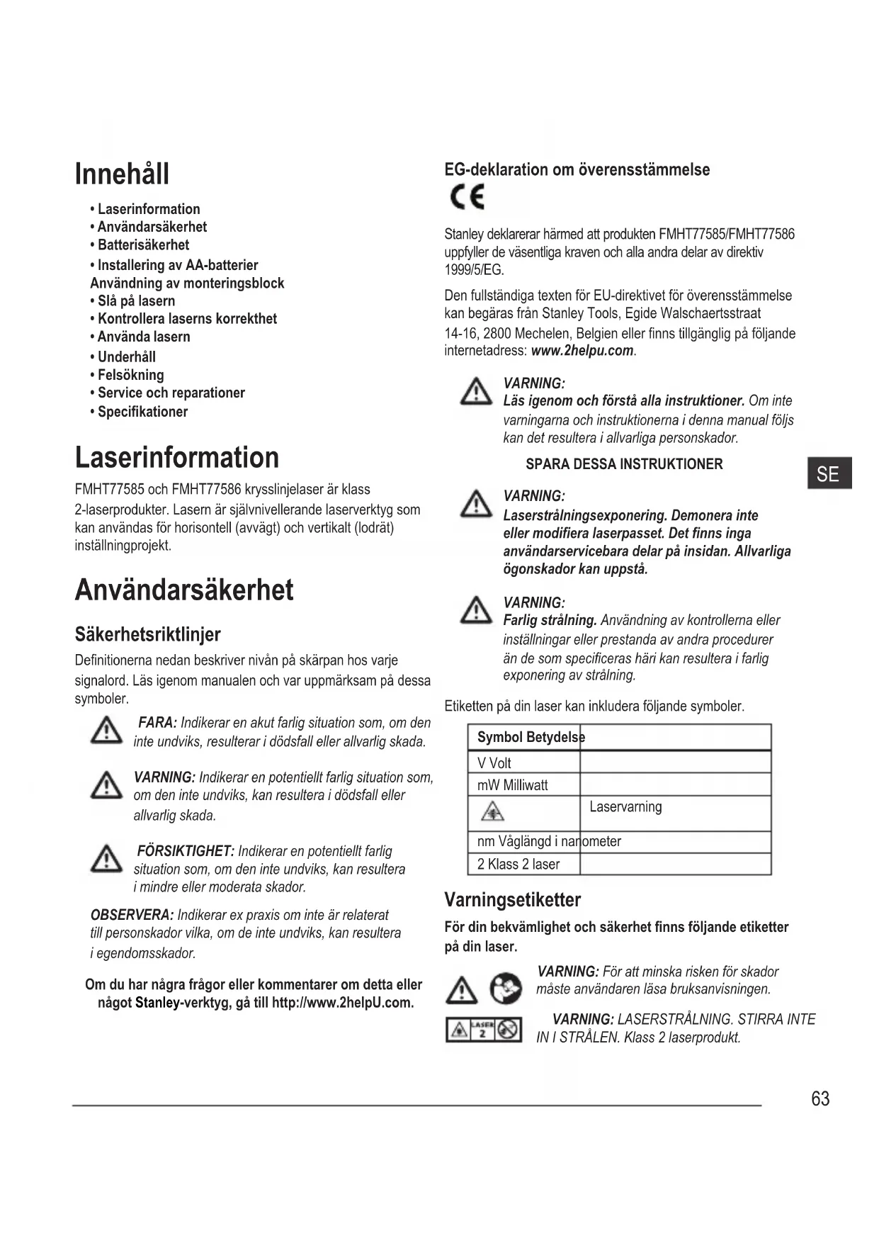 - Kalibreringskontroller och annat underhällsreparationen bör utföras av Stanley servicecenter.