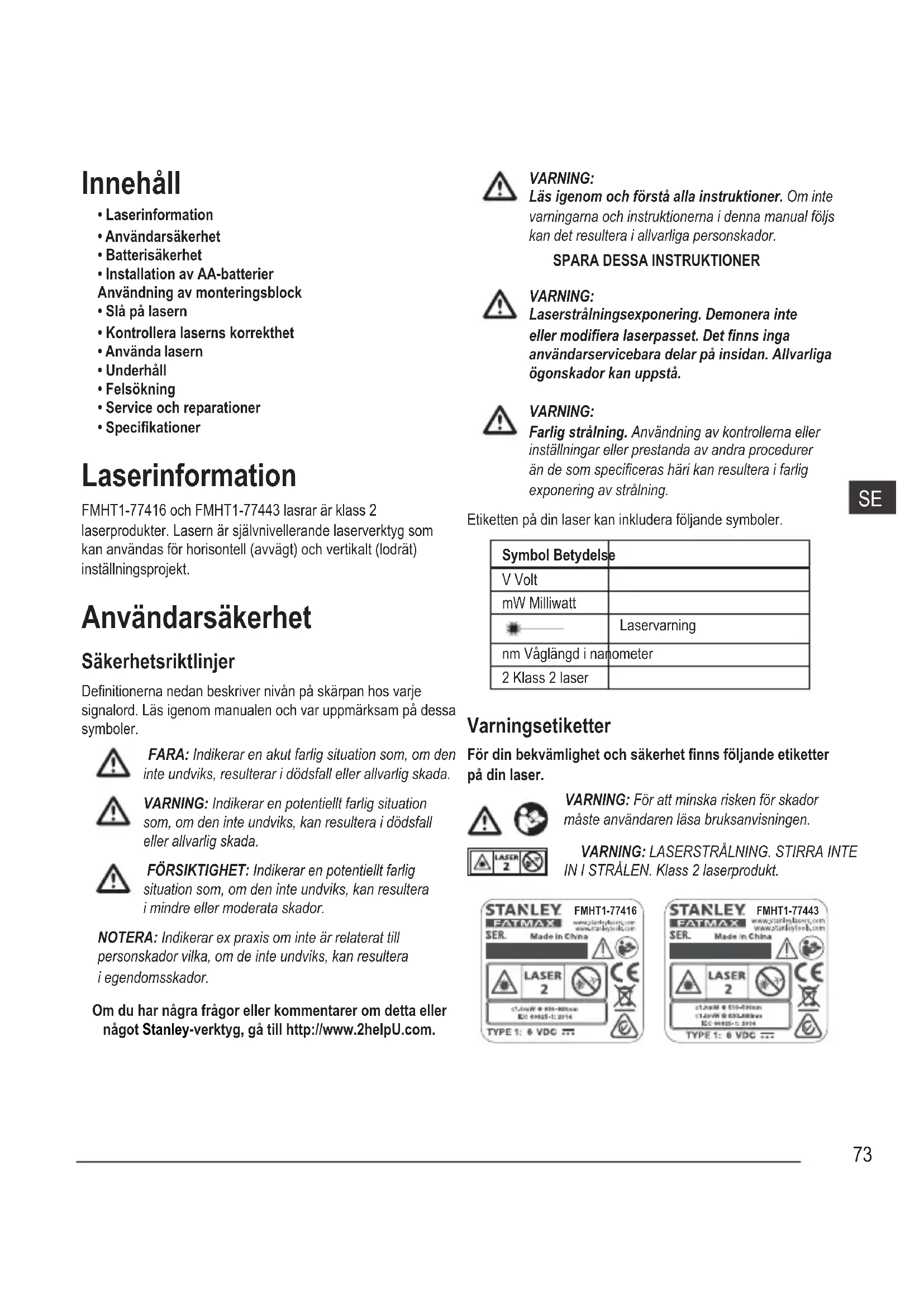 - Specikationer Laserinformation FMHT1-77416 och FMHT1-77443 lasrar är klass 2 laserprodukter. Lasern är självnivellerande laserverktyg som kan användas för horisontell (avvägt) och vertikalt (lodrät) inställningsprojekt. Användarsäkerhet Säkerhetsriktlinjer Denitionerna nedan beskriver nivån på skärpan hos varje signalord. Läs igenom manualen och var uppmärksam på dessa symboler. FARA: Indikerar en akut farlig situation som, om den inte undviks, resulterar i dödsfall eller allvarlig skada. VARNING: Indikerar en potentiellt farlig situation som, om den inte undviks, kan resultera i dödsfall eller allvarlig skada. FÖRSIKTIGHET: Indikerar en potentiellt farlig situation som, om den inte undviks, kan resultera i mindre eller moderata skador. NOTERA: Indikerar ex praxis om inte är relaterat till personskador vilka, om de inte undviks, kan resultera i egendomsskador. Om du har några frågor eller kommentarer om detta eller något Stanley-verktyg, gå till http://www.2helpU.com. VARNING: Läs igenom och förstå alla instruktioner. Om inte varningarna och instruktionerna i denna manual följs kan det resultera i allvarliga personskador.