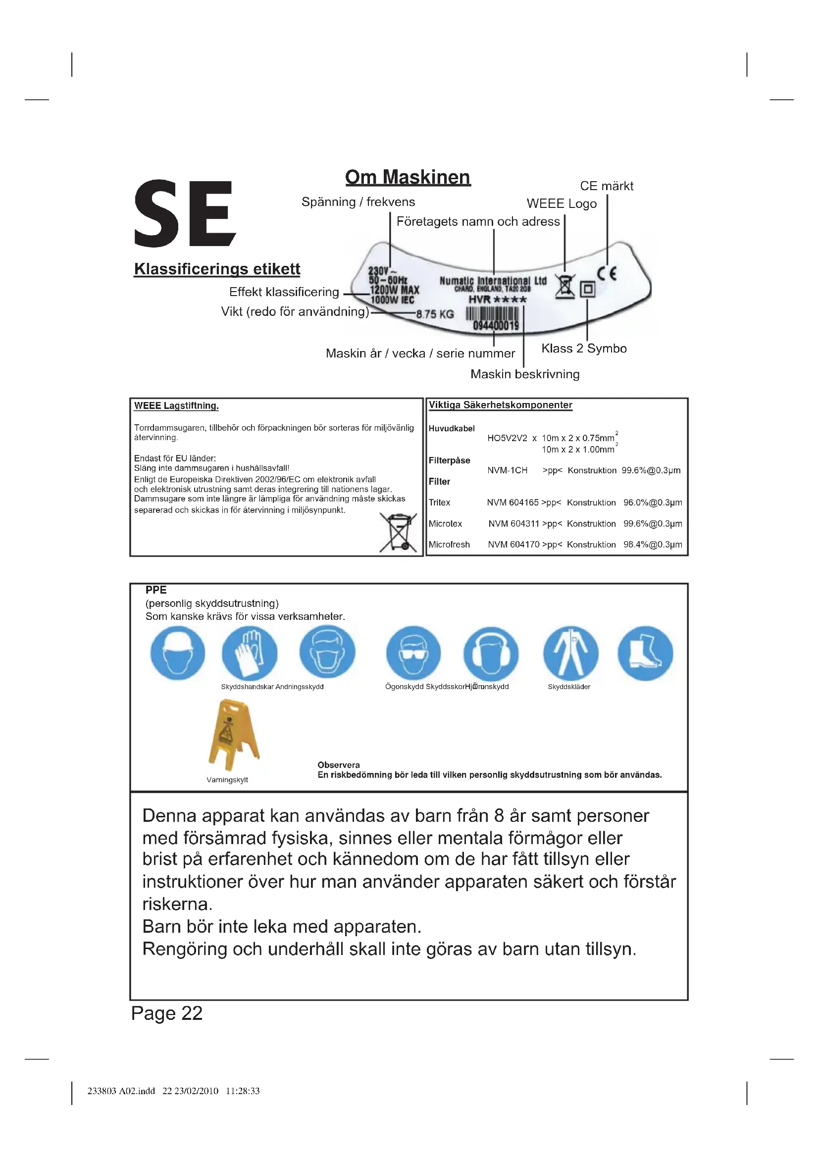 Denna apparat kan användas av barn från 8 år samt personer med försämrad fysiska, sinnes eller mentala förmågor eller brist på erfarenhet och kännedom om de har fått tillsyn eller instruktioner över hur man använder apparaten säkert och förstår riskerna. Barn bör inte leka med apparaten. Rengöring och underhåll skall inte göras av barn utan tillsyn. WEEE Lagstiftning. Torrdammsugaren, tillbehör och förpackningen bör sorteras för miljövänlig återvinning.Endast för EU länder:Släng inte dammsugaren i hushållsavfall!Enligt de Europeiska Direktiven 2002/96/EC om elektronik avfall och elektronisk utrustning samt deras integrering till nationens lagar. Dammsugare som inte längre är lämpliga för användning måste skickas separerad och skickas in för återvinning i miljösynpunkt. Page 22 233803 A02.indd 22 23/02/2010 11:28:33ORGINAL INSTRUKTIONER LÄS BRUKSANVISNINGEN INNAN APPARATEN ANVÄNDS. Information för TORRDAMMSUGARE VARNING Läs bruksanvisningen innan apparaten används. Användare skall instrueras före användning. Såsom med all elektrisk utrustning måste försiktighet iakttagas vid användande och dessutom måste rutinmäs- sigt och förebyggande underhåll göras med jämna mellanrum för att se till att maskinen fungerar på ett säkert sätt. Misslyckande att utföra nödvändigt underhåll, inklusive byte av delar i enlighet med korrekt standard, kan göra utrustning farlig och tillverkaren accepterar inget ansvar eller har inga skyldigheter när det gäller detta. Maskinen är för TORRDAMMSUGNING endast och skall inte förvaras utomhus eller användas i våta utrymmen. Maskinen skall vara urkopplad från strömuttaget vid rengörning eller underhåll och vid utbyte av delar. Maskinen är EJ avsedd för användning av barn, förutom om de hålls under uppsikt. VARNING Denna maskin lämpar sig inte för att suga upp farligt eller explosivt dam. Se till att ltreringssystemet för maskinen är lämpligt för det material som ska sugas upp. Denna maskin ska endast användas på torra plaster. Denna maskin ska endast användas inomhus. Denna maskin bör endast förvaras inomhus. OBS Denna maskin lämpar sig också för offentlig användning såsom i hotell, skolor, sjukhus, fabriker, butiker och kontor för andra ändamål än normala hemvårdsuppgifter. Denna produkt följer kraven under § 20 av EN 60335-2.69 stabilitet och mekaniska risker. Om dammsugaren slutar fungera, ta ur kontakten ur vägguttaget före undersökning av var felet ligger. Om det blir stopp i dammsugaren, stäng av, ta ur kontakten ur vägguttaget, undersök munstycket, röret och slangen efter skräp. Om munstycket, röret samt slangen är fria från skräp, byt ut dammsugarpåsen och rengör ltret. Dammsugaren bör inspekteras efter användning vid skada. Denna dammsugare är ämnad för inomhusbruk och insamling av torra material. Denna maskin lämpar sig inte för att suga upp farligt eller explosivt damm. Använd inte i våta utrymmen eller för att samla in vått material. Dammsugaren bör förvaras i torrt utrymme. RÄTT Håll maskinen ren. Håll ltren rena. Används lterpåsar, Då förbättras funktionen och maskinen halls ren. Använd en Numatic Original lterpåse om dammet är nt. Se till att slangarna och rören inte är blockerade. Byt ut alla slitna eller skadade delar omedelbart. Undersök kabeln regelbundet och leta efter tecken på skador, t.ex. sprickor eller ålderstecken. Om skador hittas måste utbytet av kabeln utföras av en kvalicerad person som använder rätt Numatic original delar. Byt dammsugarpåsen ofta. Håll spridarltret (om sådant nns) rent. Använd endast maskinens kraftuttag för ändamål som är angivna i instruktionerna. Använd endast borstarna som tillhör maskinen. Användning av andra borstar kan försämra säkerheten. Om skador hittas måste utbytet av kabeln utföras av en kvalicerad person som använder rätt Numatic original delar. Byt endast ut kabeln mot korrekt utbytesdel godkänd av Numatic. Endast Turbocare - modeller: Vid användning av kraftuttaget, använd endast tillbehör godkända av Numatic. Slangen skall kontrolleras regelbundet och får inte användas om den är skadad. Tillbehörspluggen måste tas ur kraftuttaget innan apparaten görs ren eller underhålls. FEL Försök inte att rulla ut kabeln med ett enda ryck, och dra inte i kabeln för att dra ut den ur uttaget. Sug EJ upp het aska eller tända cigarettmpar. Använd inte ångrengörare eller tryckrengörare för att rengöra maskinen och använd den inte i regn. Får EJ nedsänkas i vatten för rengöring. Utför inget underhåll på maskinen när nätkabeln är inkopplad. Page 23 233803 A02.indd 23 23/02/2010 11:28:33Ωτοασπίδες Αντιολισθητικά παπούτσιαΚράνος Ειδικά γάντια για βαριές εργασίεςΠροστασία από αλλεργιογόνες ουσίες και μάσκες Προστατευτική μάσκα Προστατευτικό ρουχισμό PPE (ΠΡΟΣΩΠΙΚΟΣ ΠΡΟΣΤΑΤΕΥΤΙΚΟΣ ΕΞΟΠΛΙΣΜΟΣ) ΓΙΑ ΟΡΙΣΜΈΝΑ ΕΊΔΗ ΕΡΓΑΣΊΑΣ ΜΠΟΡΕΊ ΝΑ ΧΡΕΙΑΣΤΕΊΤΕ: