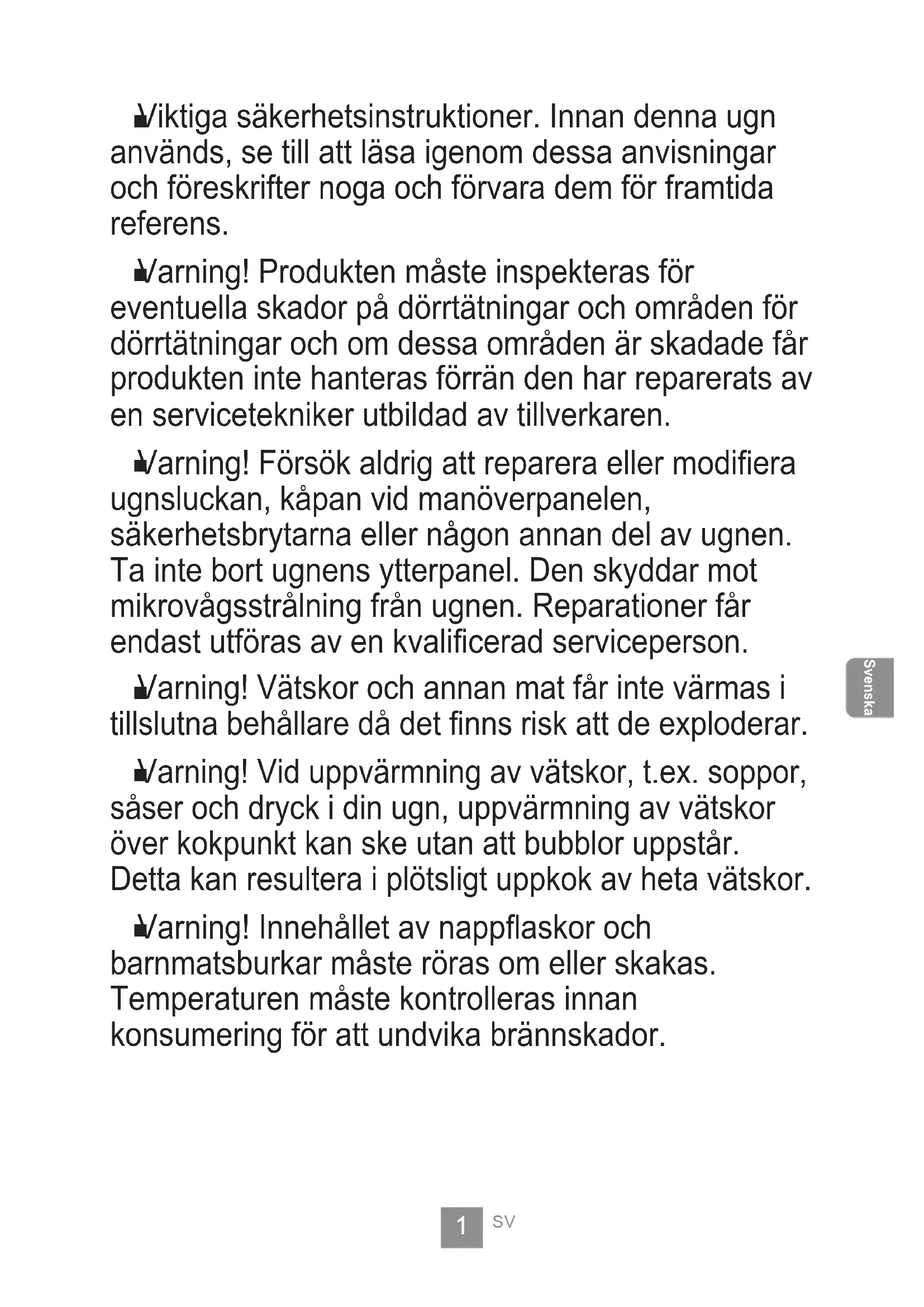 Varning! Vid uppvärmning av vätskor, t.ex. soppor, såser och dryck i din ugn, uppvärmning av vätskor över kokpunkt kan ske utan att bubblor uppstår. Detta kan resultera i plötsligt uppkok av heta vätskor.