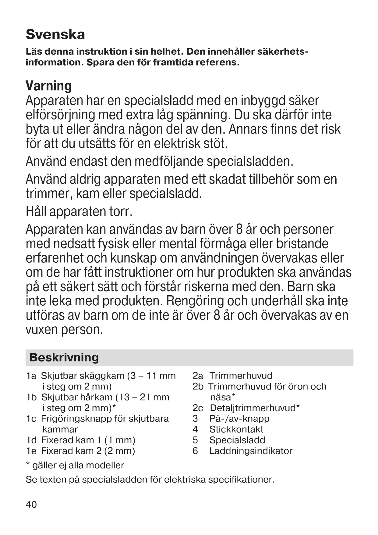 For varer kjøpt i Norge har kunden garanti i henhold til NEL’s Leverings- betingelser. 91643812_MGK3025MGK3020SK3000_MN.indd 3991643812_MGK3025MGK3020SK3000_MN.indd 39 21.09.17 11:0221.09.17 11:02 CSS APPROVED Effective Date 29Sep2017 GMT - Printed 22Nov2017 Page 39 of 5640 Svenska Läs denna instruktion i sin helhet. Den innehåller säkerhets- information. Spara den för framtida referens. Varning Apparaten har en specialsladd med en inbyggd säker elförsörjning med extra låg spänning. Du ska därför inte byta ut eller ändra någon del av den. Annars finns det risk för att du utsätts för en elektrisk stöt. Använd endast den medföljande specialsladden. Använd aldrig apparaten med ett skadat tillbehör som en trimmer, kam eller specialsladd. Håll apparaten torr. Apparaten kan användas av barn över 8 år och personer med nedsatt fysisk eller mental förmåga eller bristande erfarenhet och kunskap om användningen övervakas eller om de har fått instruktioner om hur produkten ska användas på ett säkert sätt och förstår riskerna med den. Barn ska inte leka med produkten. Rengöring och underhåll ska inte utföras av barn om de inte är över 8 år och övervakas av en vuxen person. Beskrivning 1a Skjutbar skäggkam (3 – 11 mm i steg om 2 mm) 1b Skjutbar hårkam (13 – 21 mm i steg om 2 mm)* 1c Frigöringsknapp för skjutbara kammar 1d Fixerad kam 1 (1 mm) 1e Fixerad kam 2 (2 mm) 2a Trimmerhuvud 2b Trimmerhuvud för öron och näsa* 2c Detaljtrimmerhuvud* 3 På-/av-knapp 4 Stickkontakt 5 Specialsladd 6 Laddningsindikator