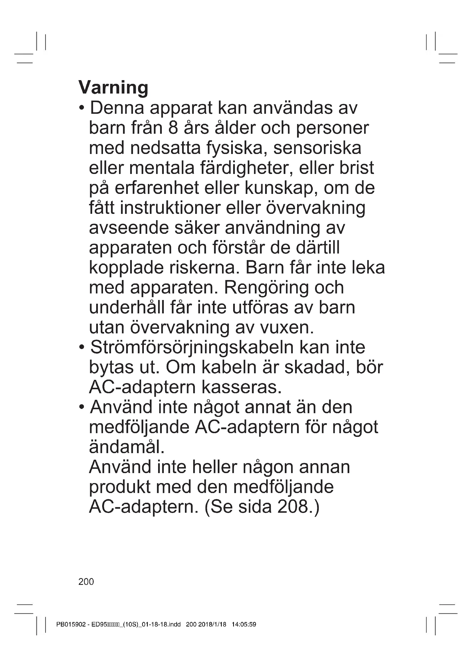 - Använd inte något annat än den medföljande AC‑adaptern för något ändamål. Använd inte heller någon annan produkt med den medföljande AC‑adaptern. (Se sida 208.) PB015902 - ED95_(10S)_01-18-18.indd 200 2018/1/18 14:05:59201 GBDFINLEDKPNSFINPLCZSKHROTR