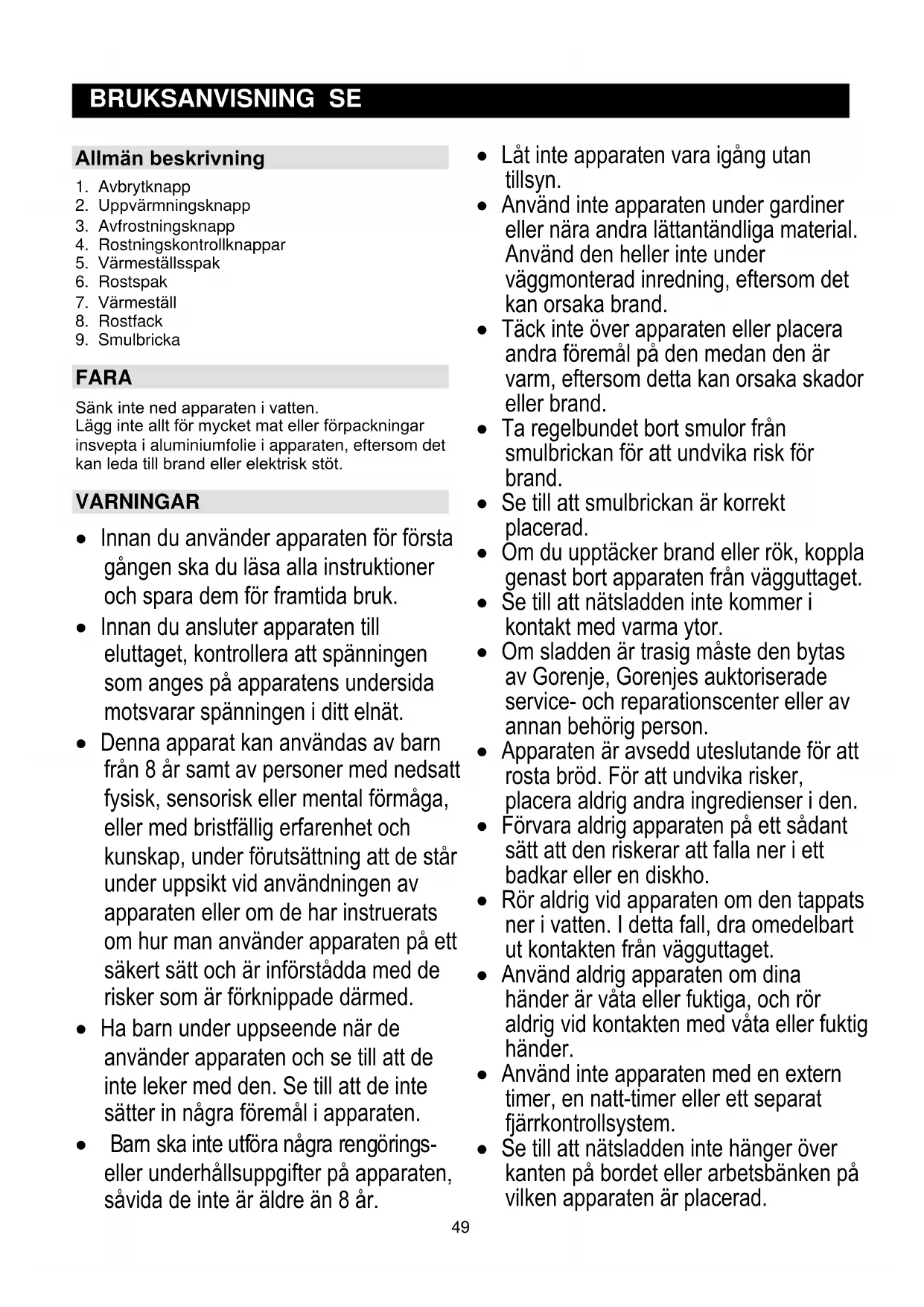 BRUKSANVISNING SE Allmän beskrivning