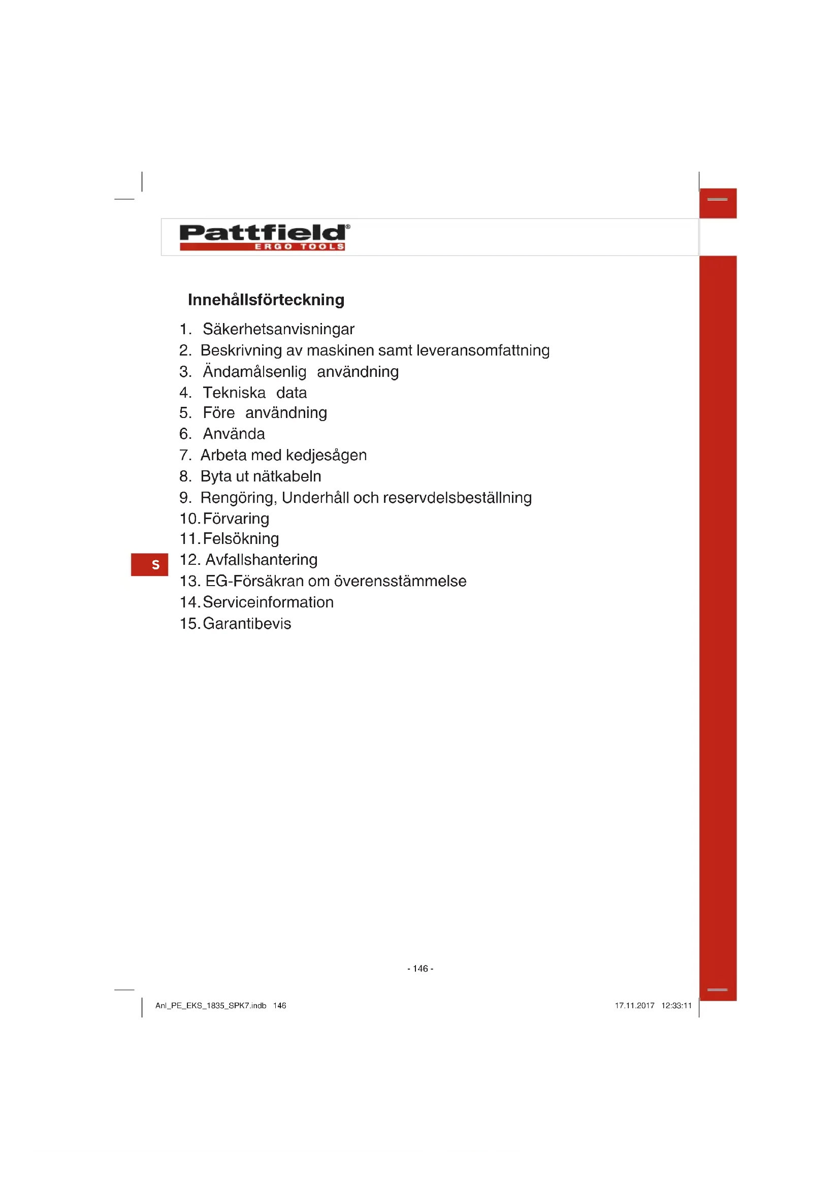 Den överkryssade soptunnan innebär att elektronisk och elektrisk utrustning (WEEE) ska avfallshanteras separat. Elektrisk och elek- tronisk utrustning kan innehålla farliga och skadliga ämnen. Dessa verktyg måste lämnas till miljöstation för återvinning av elektronik- och elskrot och får inte slängas i osorterat kommunalt avfall. Genom att göra detta hjälper du till att bevara resurserna och skydda miljön. Kontakta din återförsäljare eller lokala myndigheter för mer informati- on. Låt inte barn leka med plastpåsar eller annat förpackningsmaterial eftersom kvävningsfara och fara för andra skador föreligger. Förvara allt sådant material på säker plats eller lämna till miljövänlig återvin- ning. Med förbehåll för tekniska ändringar. Anl_PE_EKS_1835_SPK7.indb 173Anl_PE_EKS_1835_SPK7.indb 173 17.11.2017 12:33:1417.11.2017 12:33:14S