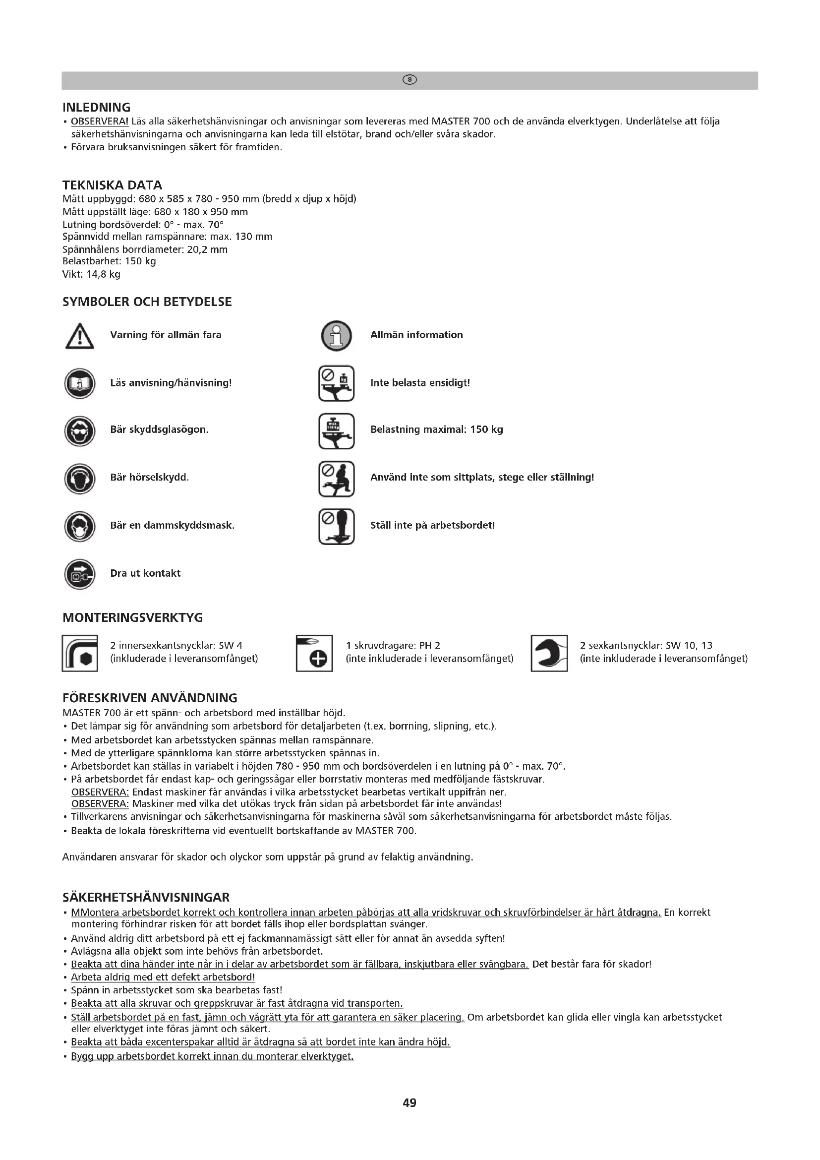 Inte belasta ensidigt! Belastning maximal: 150 kg Använd inte som sittplats, stege eller ställning! Ställ inte på arbetsbordet! Varning för allmän fara Läs anvisning/hänvisning! Bär skyddsglasögon. Bär hörselskydd. Dra ut kontakt Allmän information Bär en dammskyddsmask. MONTERINGSVERKTYG 2 innersexkantsnycklar: SW 4 (inkluderade i leveransomfånget) 1 skruvdragare: PH 2 (inte inkluderade i leveransomfånget) 2 sexkantsnycklar: SW 10, 13 (inte inkluderade i leveransomfånget)