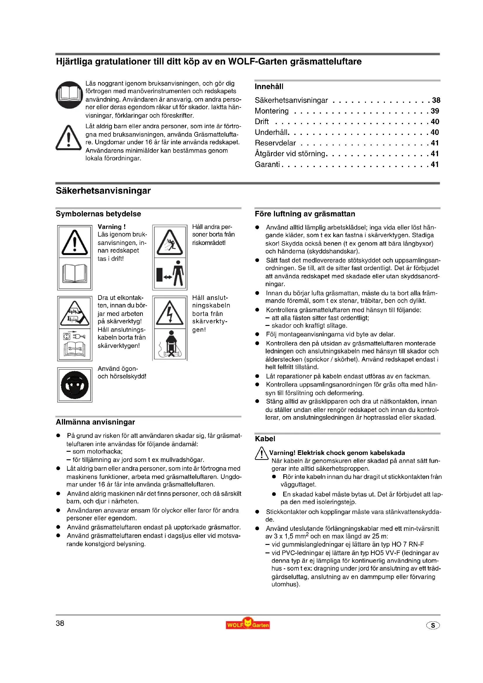 S Hjärtliga gratulationer till ditt köp av en WOLF-Garten gräsmatteluftare Innehåll Säkerhetsanvisningar . . . . . . . . . . . . . . . . 38 Montering