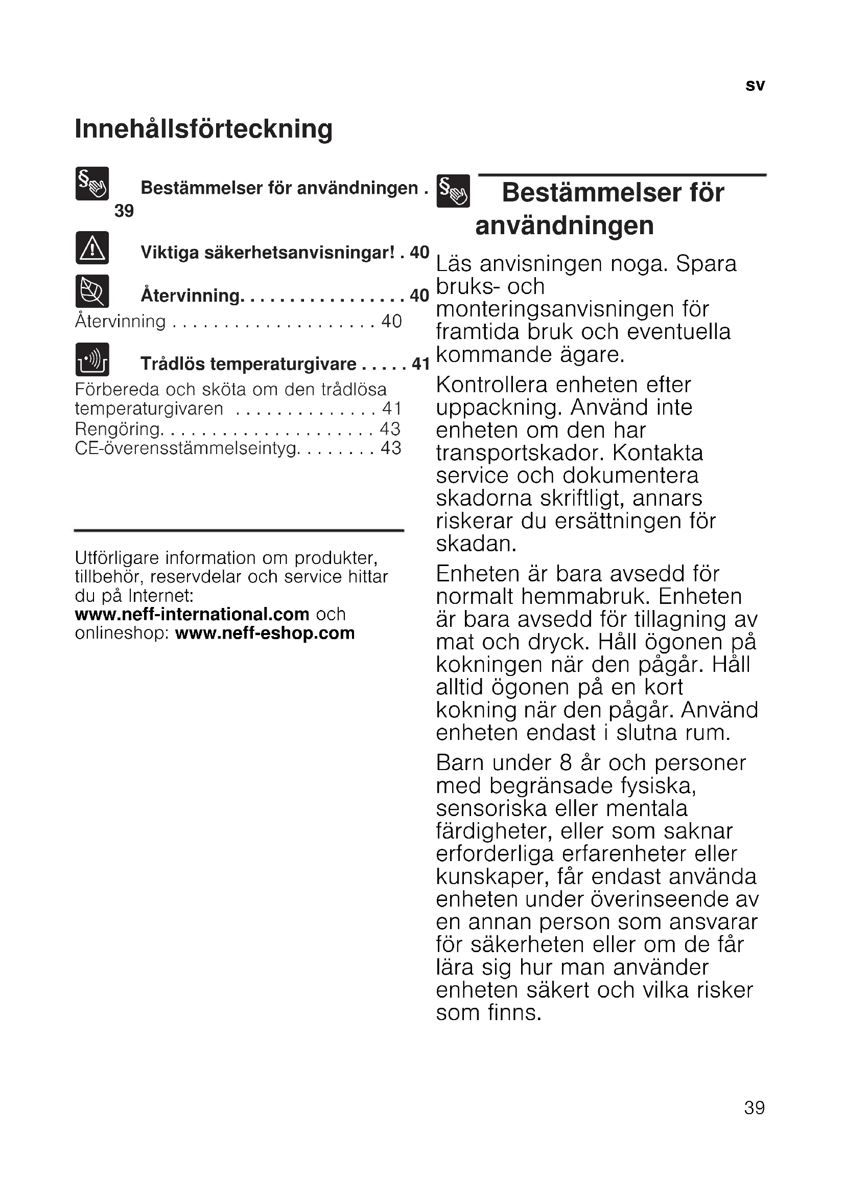 - CE-överensstämmelseintyg Produktinfo Utförligare information om produkter, tillbehör, reservdelar och service hittar du på Internet: www.neff-international.com och onlineshop: www.neff-eshop.com 8 Bestämmelser för användningen Bestämmelser för användningen Läs anvisningen noga. Spara bruks- och monteringsanvisningen för framtida bruk och eventuella kommande ägare. Kontrollera enheten efter uppackning. Använd inte enheten om den har transportskador. Kontakta service och dokumentera skadorna skriftligt, annars riskerar du ersättningen för skadan. Enheten är bara avsedd för normalt hemmabruk. Enheten är bara avsedd för tillagning av mat och dryck. Håll ögonen på kokningen när den pågår. Håll alltid ögonen på en kort kokning när den pågår. Använd enheten endast i slutna rum. Barn under 8 år och personer med begränsade fysiska, sensoriska eller mentala färdigheter, eller som saknar erforderliga erfarenheter eller kunskaper, får endast använda enheten under överinseende av en annan person som ansvarar för säkerheten eller om de får lära sig hur man använder enheten säkert och vilka risker som finns.sv p. 43