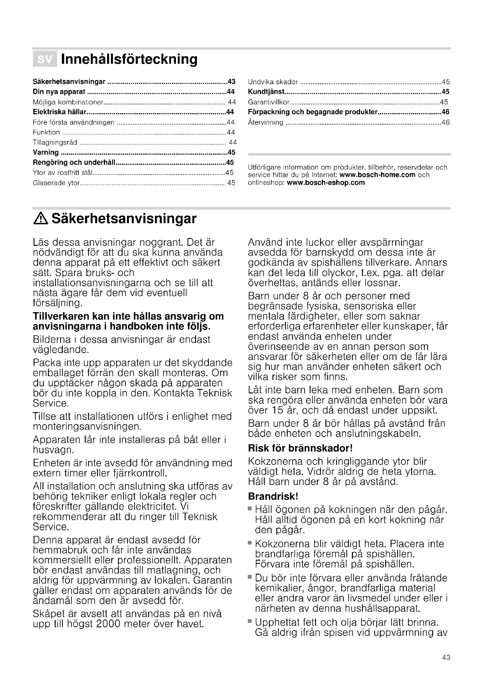 - Återvinning Produktinfo Utförligare information om produkter, tillbehör, reservdelar och service hittar du på Internet: www.bosch-home.com och onlineshop: www.bosch-eshop.com : Säkerhetsanvisningar Läs dessa anvisningar noggrant. Det är nödvändigt för att du ska kunna använda denna apparat på ett effektivt och säkert sätt. Spara bruks- och installationsanvisningarna och se till att nästa ägare får dem vid eventuell försäljning. Tillverkaren kan inte hållas ansvarig om anvisningarna i handboken inte följs. Bilderna i dessa anvisningar är endast vägledande. Packa inte upp apparaten ur det skyddande emballaget förrän den skall monteras. Om du upptäcker någon skada på apparaten bör du inte koppla in den. Kontakta Teknisk Service. Tillse att installationen utförs i enlighet med monteringsanvisningen. Apparaten får inte installeras på båt eller i husvagn. Enheten är inte avsedd för användning med extern timer eller fjärrkontroll. All installation och anslutning ska utföras av behörig tekniker enligt lokala regler och föreskrifter gällande elektricitet. Vi rekommenderar att du ringer till Teknisk Service. Denna apparat är endast avsedd för hemmabruk och får inte användas kommersiellt eller professionellt. Apparaten bör endast användas till matlagning, och aldrig för uppvärmning av lokalen. Garantin gäller endast om apparaten används för de ändamål som den är avsedd för. Skåpet är avsett att användas på en nivå upp till högst 2000 meter över havet. Använd inte luckor eller avspärrningar avsedda för barnskydd om dessa inte är godkända av spishällens tillverkare. Annars kan det leda till olyckor, t.ex. pga. att delar överhettas, antänds eller lossnar. Barn under 8 år och personer med begränsade fysiska, sensoriska eller mentala färdigheter, eller som saknar erforderliga erfarenheter eller kunskaper, får endast använda enheten under överinseende av en annan person som ansvarar för säkerheten eller om de får lära sig hur man använder enheten säkert och vilka risker som finns. Låt inte barn leka med enheten. Barn som ska rengöra eller använda enheten bör vara över 15 år, och då endast under uppsikt. Barn under 8 år bör hållas på avstånd från både enheten och anslutningskabeln. Risk för brännskador! Kokzonerna och kringliggande ytor blir väldigt heta. Vidrör aldrig de heta ytorna. Håll barn under 8 år på avstånd. Brandrisk! p. 46