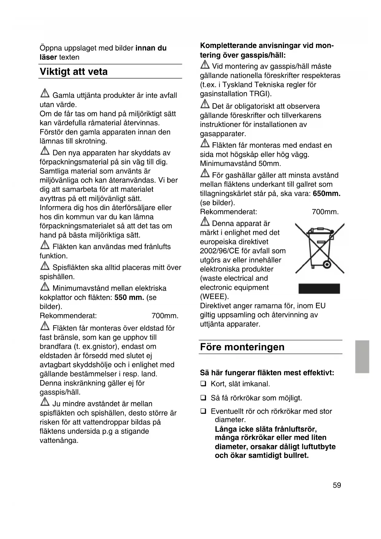 Öppna uppslaget med bilder innan du läser texten Viktigt att veta Gamla uttjänta produkter är inte avfall utan värde. Om de får tas om hand på miljöriktigt sätt kan värdefulla råmaterial återvinnas. Förstör den gamla apparaten innan den lämnas till skrotning. Den nya apparaten har skyddats av förpackningsmaterial på sin väg till dig. Samtliga material som använts är miljövänliga och kan återanvändas. Vi ber dig att samarbeta för att materialet avyttras på ett miljövänligt sätt. Informera dig hos din återförsäljare eller hos din kommun var du kan lämna förpackningsmaterialet så att det tas om hand på bästa miljöriktiga sätt. Fläkten kan användas med frånlufts funktion. Spisfläkten ska alltid placeras mitt över spishällen. Minimumavstånd mellan elektriska kokplattor och fläkten: 550 mm. (se bilder). Rekommenderat: 700mm. Fläkten får monteras över eldstad för fast bränsle, som kan ge upphov till brandfara (t. ex.gnistor), endast om eldstaden är försedd med slutet ej avtagbart skyddshölje och i enlighet med gällande bestämmelser i resp. land. Denna inskränkning gäller ej för gasspis/häll. Ju mindre avståndet är mellan spisfläkten och spishällen, desto större är risken för att vattendroppar bildas på fläktens undersida p.g a stigande vattenånga. Kompletterande anvisningar vid mon- tering över gasspis/häll: Vid montering av gasspis/häll måste gällande nationella föreskrifter respekteras (t.ex. i Tyskland Tekniska regler för gasinstallation TRGI). Det är obligatoriskt att observera gällande föreskrifter och tillverkarens instruktioner för installationen av gasapparater. Fläkten får monteras med endast en sida mot högskåp eller hög vägg. Minimumavstånd 50mm. För gashällar gäller att minsta avstånd mellan fläktens underkant till gallret som tillagningskärlet står på, ska vara: 650mm. (se bilder). Rekommenderat: 700mm. Denna apparat är märkt i enlighet med det europeiska direktivet 2002/96/CE för avfall som utgörs av eller innehåller elektroniska produkter (waste electrical and electronic equipment (WEEE). Direktivet anger ramarna för, inom EU giltig uppsamling och återvinning av uttjänta apparater. Före monteringen Sä här fungerar fläkten mest effektivt: Kort, slät imkanal. Så få rörkrökar som möjligt. Eventuellt rör och rörkrökar med stor diameter. Långa icke släta frånluftsrör, många rörkrökar eller med liten diameter, orsakar dåligt luftutbyte och ökar samtidigt bullret.60