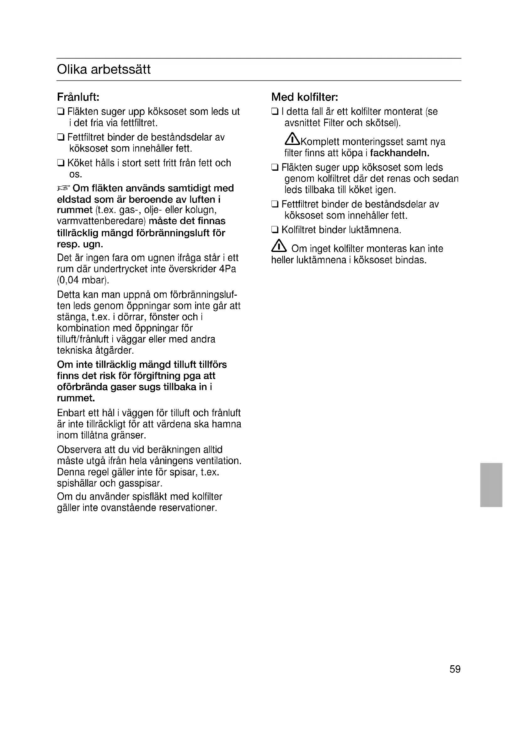 cuidado, utilizando uma chave de para- fusos.59 Olika arbetssätt Frånluft: ❑ Fläkten suger upp köksoset som leds ut i det fria via fettfiltret. ❑ Fettfiltret binder de beståndsdelar av köksoset som innehåller fett. ❑ Köket hålls i stort sett fritt från fett och os.