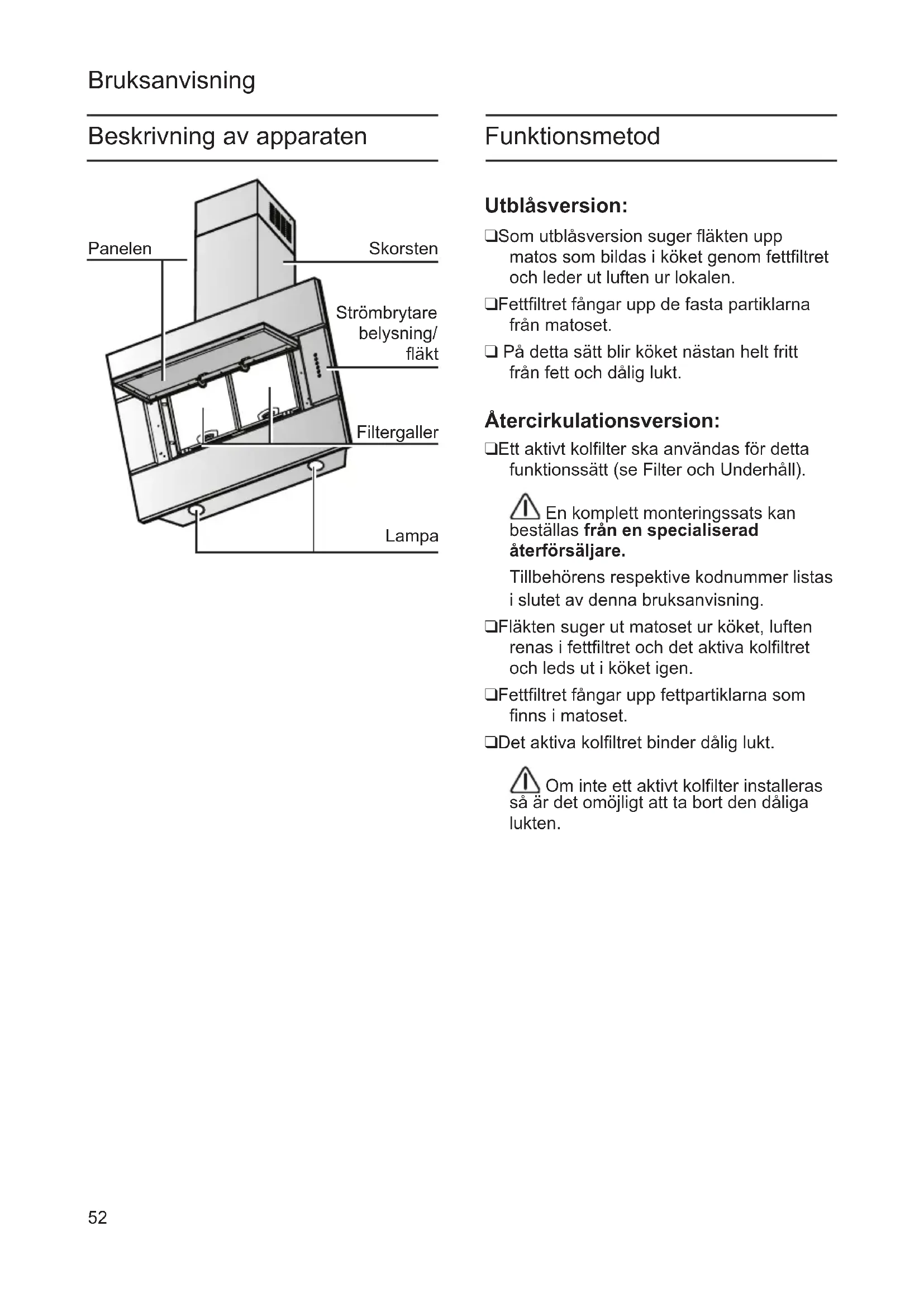 a ficha na tomada ou alimentar novamente o quadro eléctrico. Problemas de funcionamento Para eventuais perguntas ou em caso de problemas de funcionamento, chamar o serviço de assistência. (Ver lista dos centros de assistência). Durante a chamada, indicar os seguintes números: N° E FD Marcar os números correspondentes da própria coifa no quadro acima. O numero de série (n°e) e a data da produção (FD) se encontram no interior do aparelho, na placa de sinalização acessível uma vez tirada a grelha.52 Bruksanvisning Funktionsmetod Utblåsversion: ❑ Som utblåsversion suger fläkten upp matos som bildas i köket genom fettfiltret och leder ut luften ur lokalen. ❑ Fettfiltret fångar upp de fasta partiklarna från matoset. ❑ På detta sätt blir köket nästan helt fritt från fett och dålig lukt. Återcirkulationsversion: ❑ Ett aktivt kolfilter ska användas för detta funktionssätt (se Filter och Underhåll). En komplett monteringssats kan beställas från en specialiserad återförsäljare. Tillbehörens respektive kodnummer listas i slutet av denna bruksanvisning. ❑ Fläkten suger ut matoset ur köket, luften renas i fettfiltret och det aktiva kolfiltret och leds ut i köket igen. ❑ Fettfiltret fångar upp fettpartiklarna som finns i matoset. ❑ Det aktiva kolfiltret binder dålig lukt. Om inte ett aktivt kolfilter installeras så är det omöjligt att ta bort den dåliga lukten. Beskrivning av apparaten Skorsten Strömbrytare belysning/ fläkt Lampa Filtergaller Panelen53 Innan apparaten sätts i bruk för första gången Viktiga anmärkningar: ❑ Bruksanvisningarna gäller för flera versioner av denna apparat. Därför är det möjligt att dessa innehåller beskrivningar av enskilda egenskaper som inte gäller din specifika apparat. ❑ Denna köksfläkt har tillverkats i enlighet med alla viktiga säkerhetsföreskrifter. Reparationer ska endast utföras av kvalificerad teknisk personal. Felaktiga reparationer kan medföra allvarliga risker för användaren. ❑ Läs noga genom denna bruksanvisning innan apparaten används för första gången. Den innehåller viktig information, såväl beträffande den personliga säkerheten som apparatens skötsel ❑ Vi rekommenderar att spara bruks- och monteringsanvisningarna för eventuella kommande ägare. Kassera emballagematerialet på ett korrekt sätt (se Monteringsanvisningarna ). Denna köksfläkt är endast avsedd för privat bruk. Gör alltid fläkten strömlös innan någon typ av underhållsarbete eller rengöring inleds genom att dra ur kontakten eller slå av bostadens huvudströmbrytare. Apparaten får inte användas av barn eller personer med reducerad rörelseförmåga eller mental kapacitet, eller personer som saknar erfarenhet och kännedom om apparaten, såtillvida inte användandet övervakas eller instruktioner ges av erfaren person som ansvarar för säkerheten. Barn får inte lämnas utan uppsikt för att förhindra att de leker med apparaten. Fläkten får alridg användas utan att gallret är korrekt monterat! Fläkten får ALDRIG användas som avställningsyta om inte detta är uttryckligen angivet. Lokalen skall vara ordentligt ventilerad när köksfläkten används tillsammans med andra apparater vilka matas med gas och andra typer av bränsle. Utblåsningsluften får inte ledas in i rökkanal som används för avledning av rökångor som kommer från apparater vilka matas med gas eller andra typer av bränsle. Det är strängt förbjudet att flambera mat under fläkten. Öppna lågor skadar filtren och kan orsaka brand och skall därför undvikas i alla lägen. Frityrkokning skall ske under uppsikt för att undvika att överhettad olja fattar eld. Vad beträffar de tekniska och säkerhetsåtgärder som skall vidtas för avledning av utblåsningsluften, skall de föreskrifter som utfärdats av lokala myndigheter noga efterlevas. Rengör fläkten ofta, såväl utvändigt som invändigt, (MINST EN GÅNG I MÅNADEN, och respektera under alla händelser samtliga underhållsinstruktioner i denna manual). Bristande rengöring av fläkten och filtren samt ett uteblivet byte av filtren medför brandfara. Använd eller lämna aldrig fläkten utan korrekt imonterade lampor för att undvika risken för elektriska stötar. Tillverkaren frånsäger sig allt ansvar för eventuella problem eller bränder som orsakats av att instruktionerna i denna manual inte efterlevts.54 Hur fläkten fungerar fläkten stängs av eller återgår till den tidigare valda hastigheten. OBS: Denna funktion kan ställas in så att fläkten i alla lägen stängs av efter 5 minuters funktion (oavsett om en annan utsugningshastighet (effekt) var inställd tidigare), i detta syfte skall tangenten efter att ha tryckts in, tryckas in igen och hållas intryckt, tangenten börjar blinka vilket indikerar att den önskade funktionen har aktiverats. Tangent för reset efter filtrens mättning: fläkten signalerar med hjälp av lampan i denna knapp att filtren kräver ett underhåll Tangenten lyser med rött blinkande sken: utför ett underhåll av fettfiltret varefter tangenten trycks in under mer än 3 sekunder varefter tangenten slocknar. Tangenten lyser med rött sken: utför ett underhåll av kolfiltret varefter tangenten trycks in under mer än 3 sekunder och tangenten slocknar. Varning: fläkten är förinställd för att signalera endast fettfiltrets mättning. Aktivering av signalering för kolfiltrets mättning: Ställ fläkten på OFF, tryck på tangent under mer än 3 sekunder (tangenten tänds med rött sken vilket signalerar att inställningen ägt rum). För att avaktivera signaleringen av kolfiltret upprepas proceduren ovan. Den effektivaste metoden för att eliminera matos i vid matlagningen är följande: ❑ Starta köksfläkten så snart matlagningen inleds. ❑ Stäng av köksfläkten några minuter efter att matlagningen avslutats. ON/OFF- Tangent Belysning: tryck för att tända och släcka belysningen. OFF-tangent