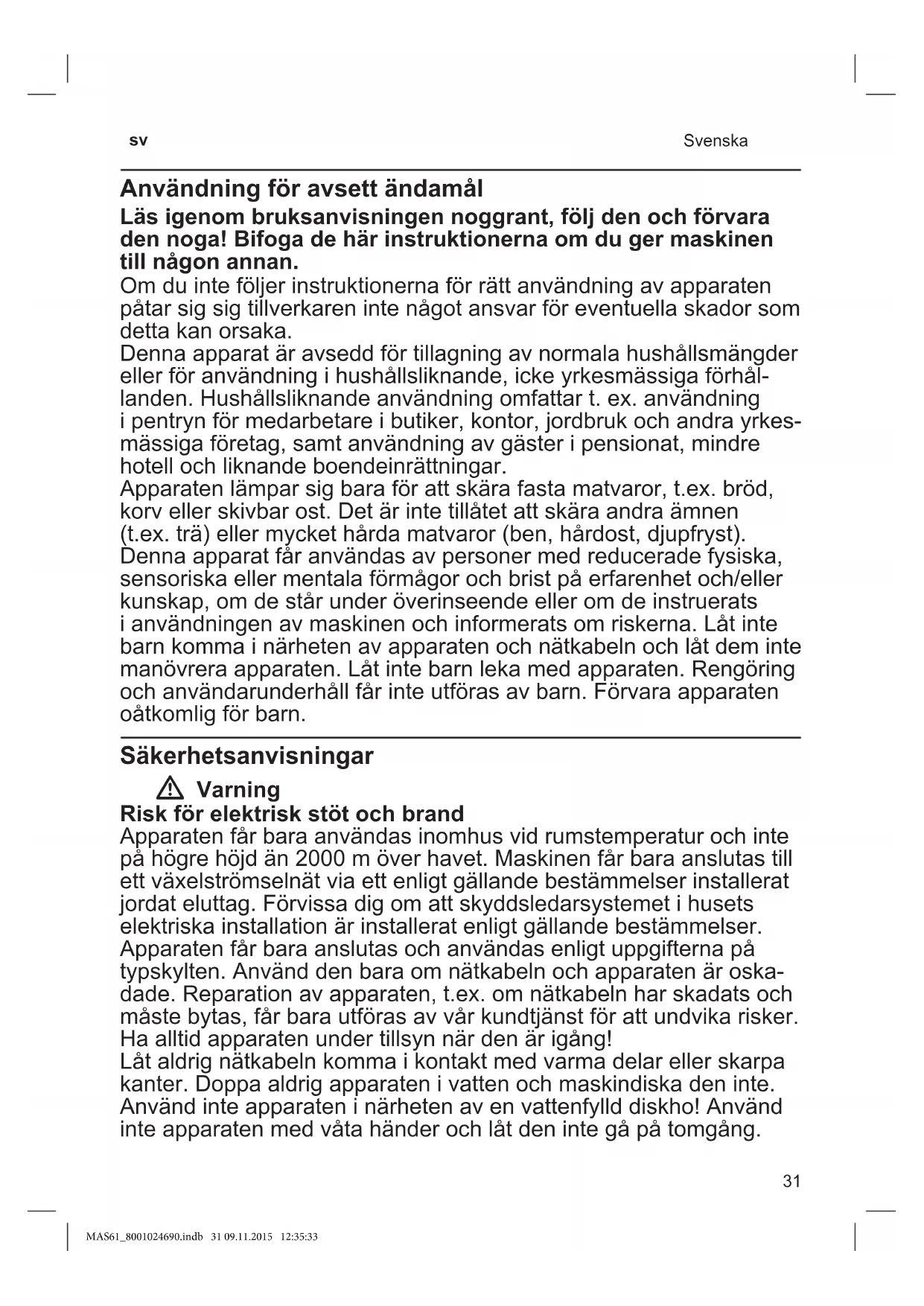 - Konsumentbestämmelser Draalltidutnätkabelnuruttageteftervarjeanvändning,närduinte harapparatenunderuppsikt,förehopsättning,isärtagningellerren- göringochomettfelskulleuppkomma.Innandubytertillbehöreller tillsatsersomrörsigunderanvändningenmåsteduförststängaav apparatenochdrautnätkabelnuruttaget. W Varning Risk för personskador Knivenärmycketvass.Låtaldrighändernakommainärhetenav kniven.Efteravstängningfortsätterdrivuttagetattroteraenkort stund.Väntatillsknivenstårstilla!Ställinskivtjocklekenpå0när arbetetärfärdigt.Närduanvänderapparatenmåstematarvagnen ochresthållarensittapåplatsomintedettaäromöjligtpågrundav matvarornasstorlekochform. Drautstickkontaktenochlossaknivenförerengöringen.Fattaaldrig kniveniklinganutanbaraiknivhållaren.Underettströmavbrottär apparatenfortfarandepåslagenochstartarsedanpånytt. W Varning Motornkanbliöverhettad!Låtapparatensvalnaefter högst10minutersoavbrutenanvändning. W Varning Kvävningsrisk Låtintebarnlekamedförpackningsmaterialet. MAS61_8001024690.indb 32 09.11.2015 12:35:33 33 p. 34