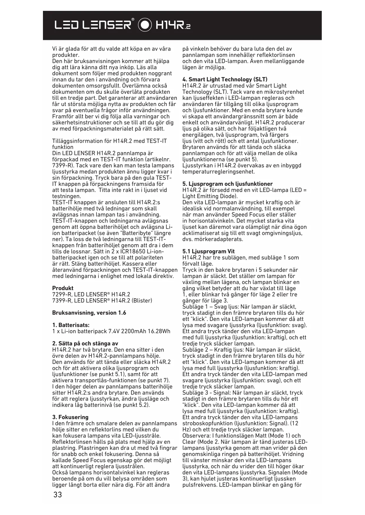 H14R.2 ar utrustad med var Smart Light Technology (SLT). Tack vare en mikrostyrenhet kan lijuseffekten i LED-lampan regleras och användaren fär tillgangt till olicaljusprogram ochljusfunktioner.Med en enda brytare kunde vi skapa ett anvandargränssnitt som ar bade enkelt och användarvanligt.H14R.2 producerarljus pa olika satt,och har foljaktligen tvagenergilagen, tvåljusprogram, tvafargers ljus (vitt och rott) och ett antalljusfungtioner. Brytaren anvands for att tanda och släcka pannlampan och for att valja mellan de olikaljusfungtionerna (se punkt 5). Ljusstyrkan i H14R.2 overvakas av en inbyggd temperaturregleringsenhet.