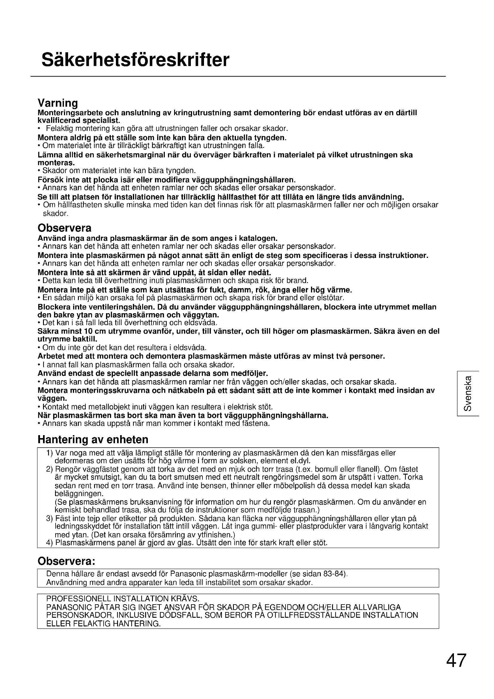 - I annat fall kan plasmaskärmen falla och orsaka skador. Använd endast de speciellt anpassade delarna som medföljer.