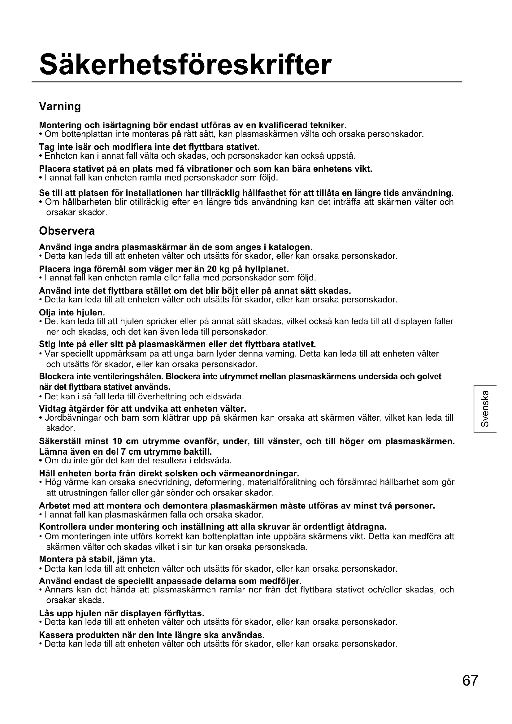 - Om hållbarheten blir otillräcklig efter en längre tids användning kan det inträffa att skärmen välter och orsakar skador. Observera Använd inga andra plasmaskärmar än de som anges i katalogen.