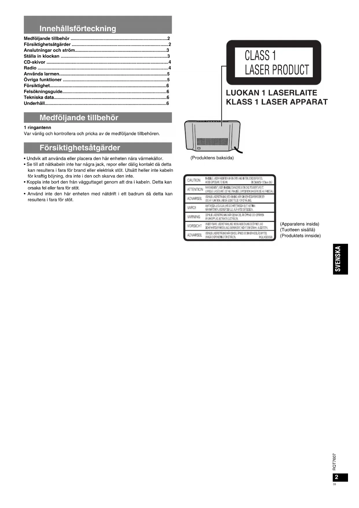 - Underhåll ringantenn Var vänlig och kontrollera och pricka av de medföljande tillbehören.• Undvik att använda eller placera den här enheten nära värmekällor.• Se till att nätkabeln inte har några jack, repor eller dålig kontakt då dettakan resultera i fara för brand eller elektrisk stöt. Utsätt heller inte kabelnför kraftig böjning, dra inte i den och skarva den inte.• Koppla inte bort den från vägguttaget genom att dra i kabeln. Detta kanorsaka fel eller fara för stöt.• Använd inte den här enheten med nätdrift i ett badrum då detta kanresultera i fara för stöt. Innehållsförteckning Medföljande tillbehör Försiktighetsåtgärder CLASS 1 LASER PRODUCT LUOKAN 1 LASERLAITE p. 61