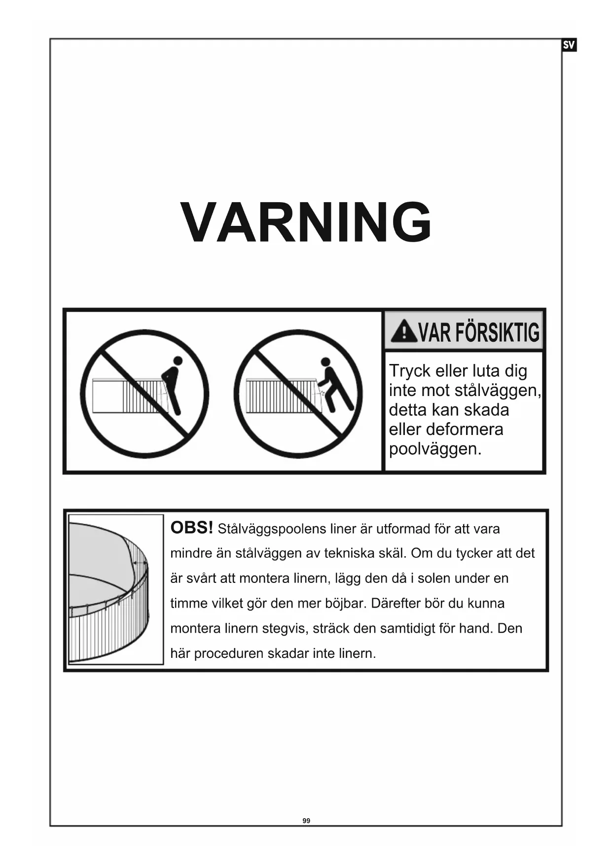 10 cm #04 #0899 Tryck eller luta dig inte mot stålväggen, detta kan skada eller deformera poolväggen. OBS! Stålväggspoolens liner är utformad för att vara mindre än stålväggen av tekniska skäl. Om du tycker att det är svårt att montera linern, lägg den då i solen under en timme vilket gör den mer böjbar. Därefter bör du kunna montera linern stegvis, sträck den samtidigt för hand. Den här proceduren skadar inte linern. VARNING