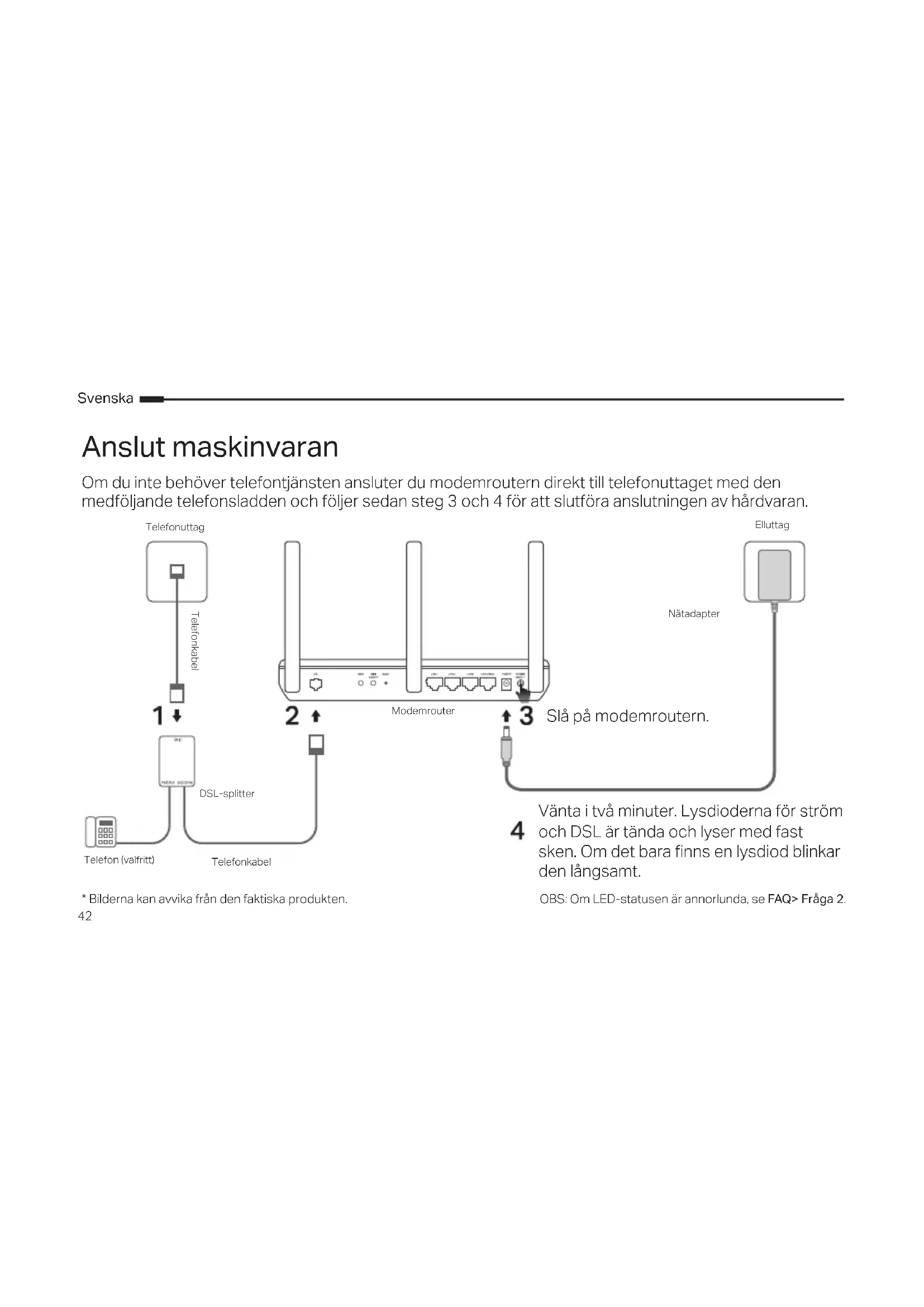 Anslut maskinvaran Om du inte behöver telefontjänsten ansluter du modemroutern direkt till telefonuttaget med den medföljande telefonsladden och följer sedan steg 3 och 4 för att slutföra anslutningen av hårdvaran.