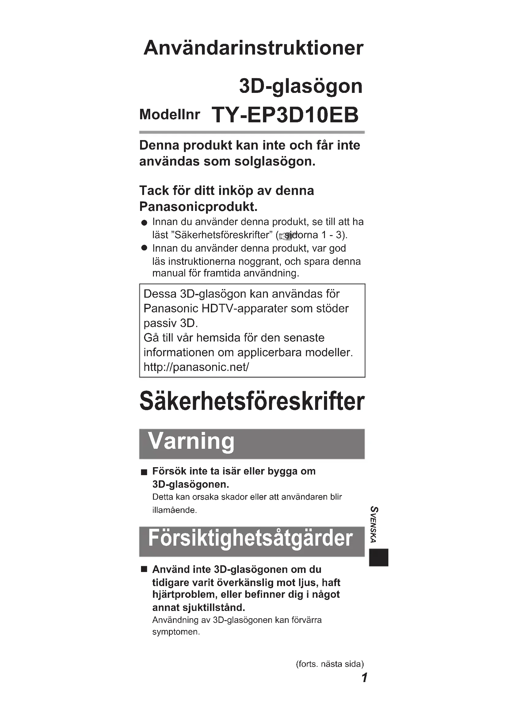 Innan du använder denna produkt, var god läs instruktionerna noggrant, och spara denna manual för framtida användning.Dessa 3D-glasögon kan användas för Panasonic HDTV-apparater som stöder passiv 3D.Gå till vår hemsida för den senaste informationen om applicerbara modeller.http://panasonic.net/ Säkerhetsföreskrifter Varning