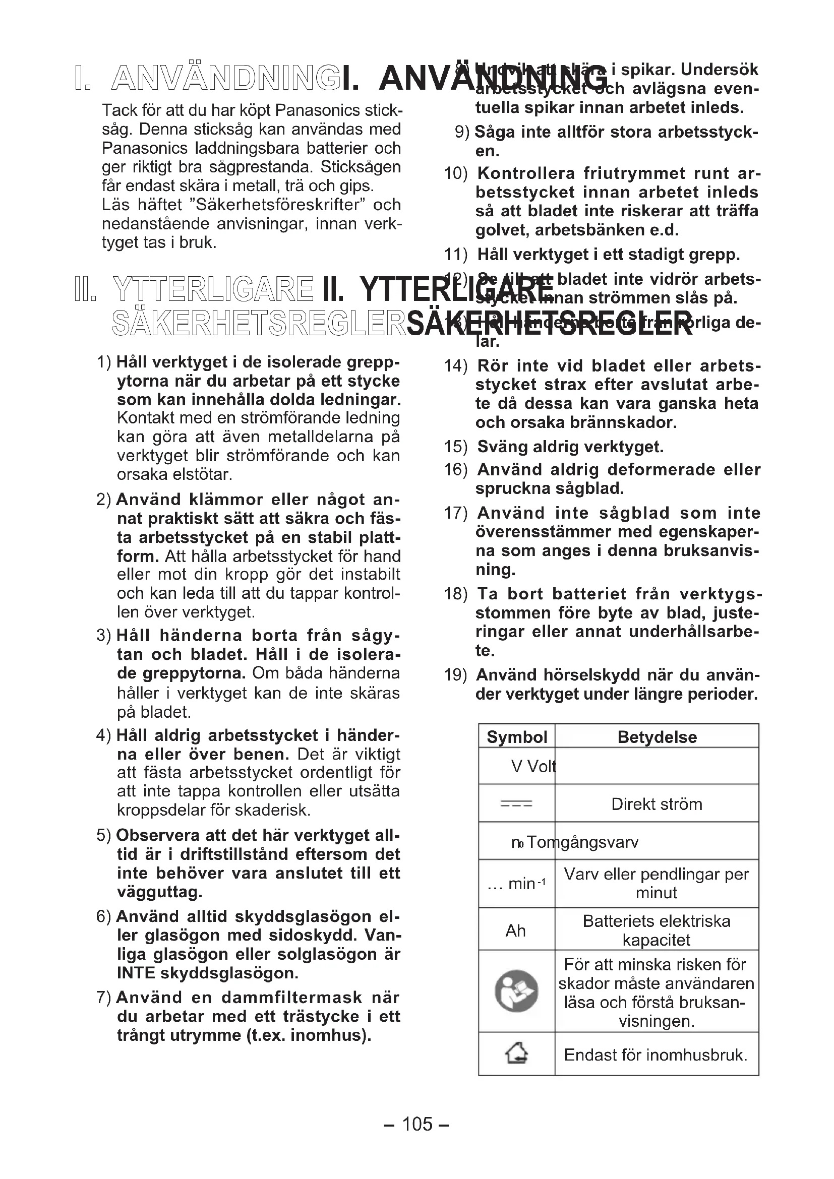 Tack för att du har köpt Panasonics stick- såg. Denna sticksåg kan användas med Panasonics laddningsbara batterier och ger riktigt bra sågprestanda. Sticksågen får endast skära i metall, trä och gips. Läs häftet ”Säkerhetsföreskrifter” och nedanstående anvisningar, innan verk- tyget tas i bruk.