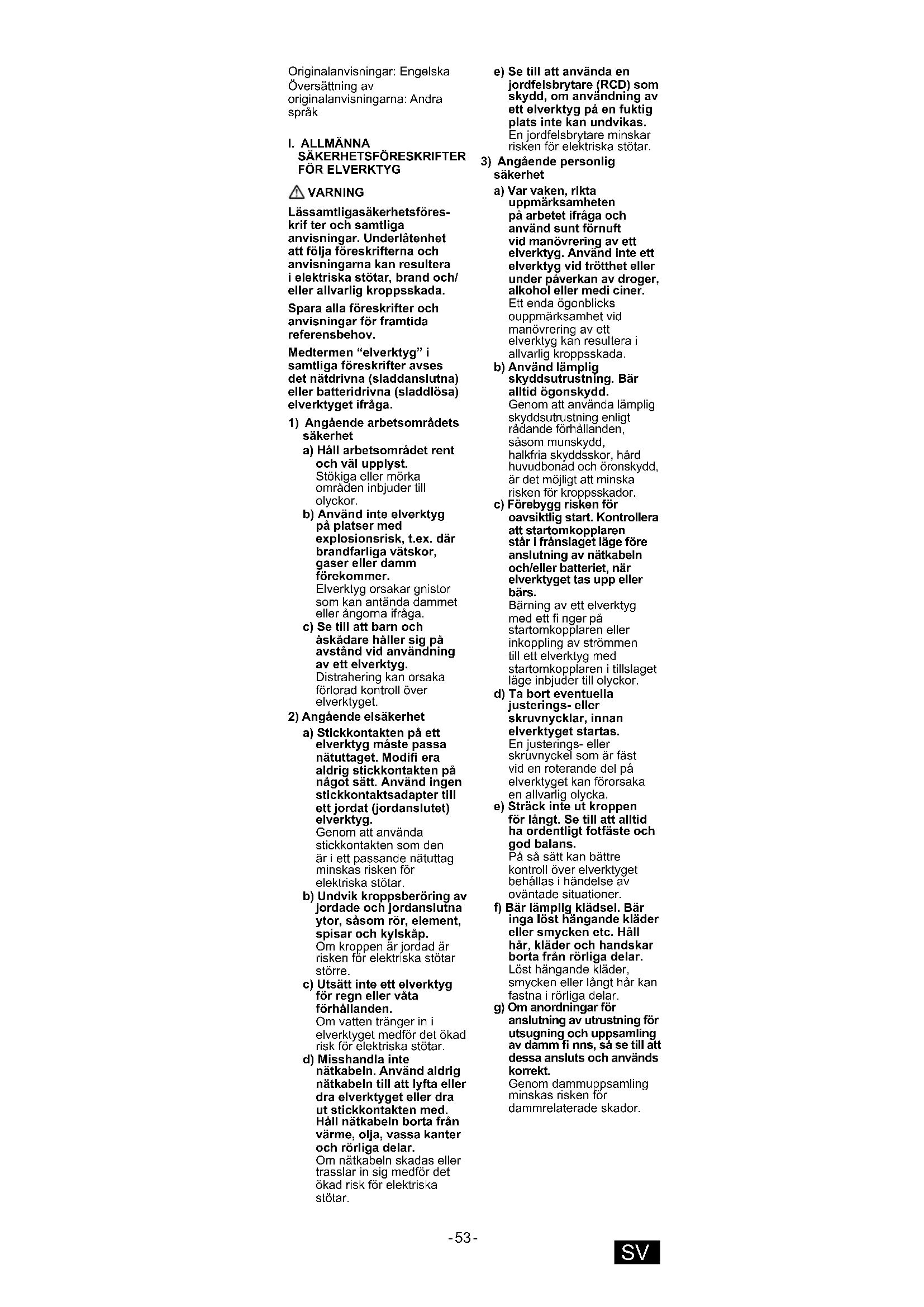 VARNING Lässamtligasäkerhetsföres- krif ter och samtliga anvisningar. Underlåtenhet att följa föreskrifterna och anvisningarna kan resultera i elektriska stötar, brand och/ eller allvarlig kroppsskada. Spara alla föreskrifter och anvisningar för framtida referensbehov. Medtermen “elverktyg” i samtliga föreskrifter avses det nätdrivna (sladdanslutna) eller batteridrivna (sladdlösa) elverktyget ifråga.