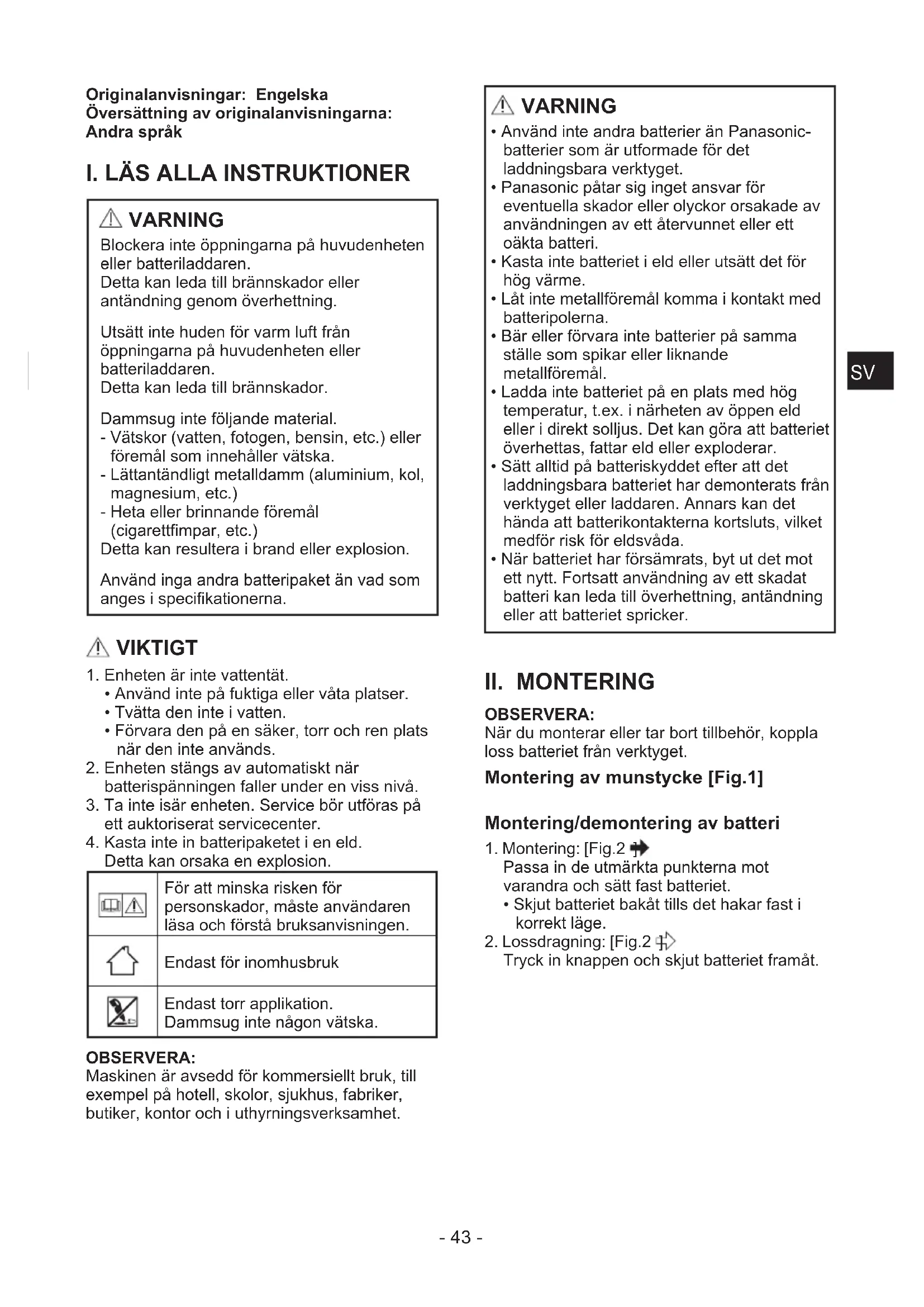- Använd inte andra batterier an Panasonic-batterier som ar utformade for det laddningsbara verktyget.