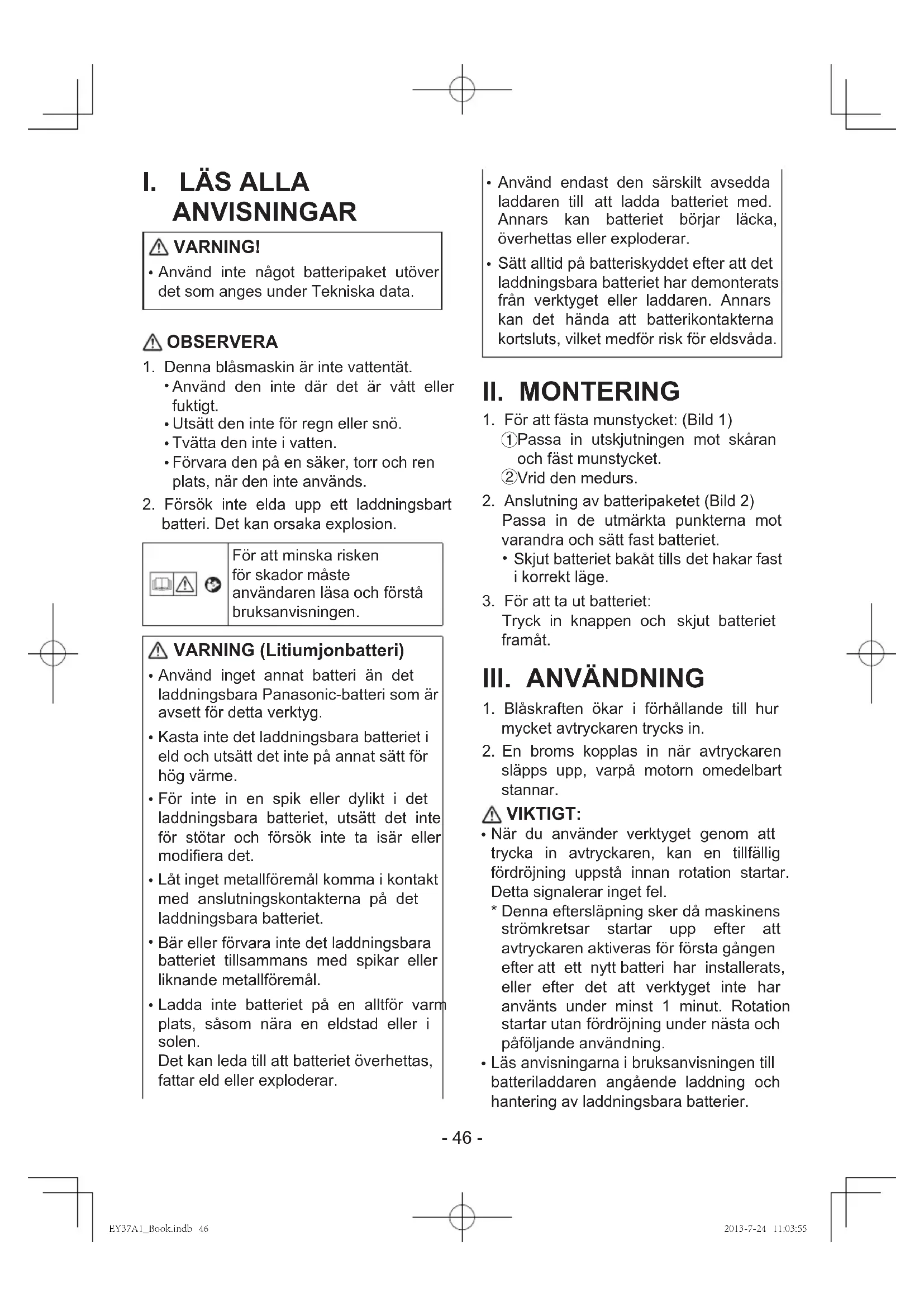 batteriladdaren angående laddning och hantering av laddningsbara batterier. EY37A1_Book.indb 46 2013-7-24 11:03:55- 47 -