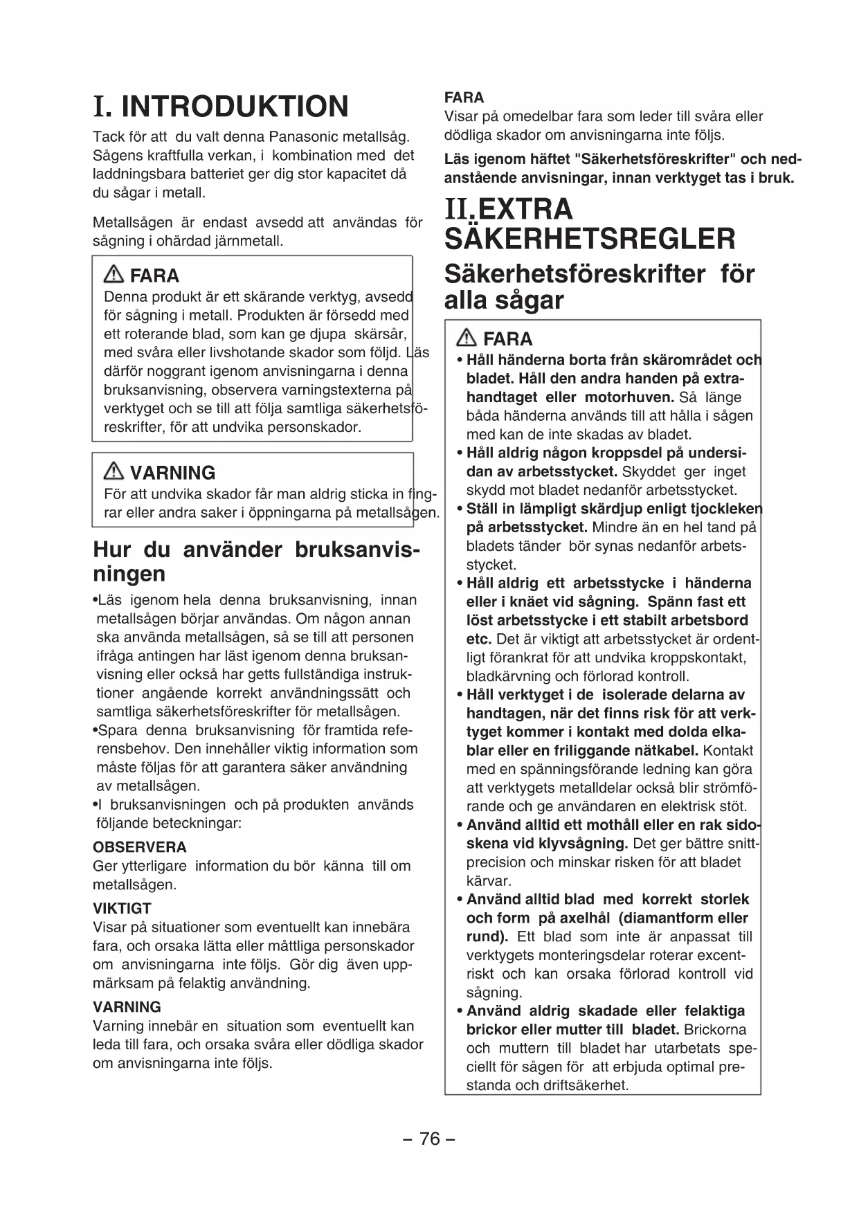 Tack för att du valt denna Panasonic metallsåg. Sågens kraftfulla verkan, i kombination med det laddningsbara batteriet ger dig stor kapacitet då du sågar i metall.Metallsågen är endast avsedd att användas för sågning i ohärdad järnmetall. FARA Denna produkt är ett skärande verktyg, avsedd för sågning i metall. Produkten är försedd med ett roterande blad, som kan ge djupa skärsår, med svåra eller livshotande skador som följd. Läs därför noggrant igenom anvisningarna i denna bruksanvisning, observera varningstexterna på verktyget och se till att följa samtliga säkerhetsfö-reskrifter, för att undvika personskador. VARNING För att undvika skador får man aldrig sticka in fing-rar eller andra saker i öppningarna på metallsågen. Hur du använder bruksanvis- ningen